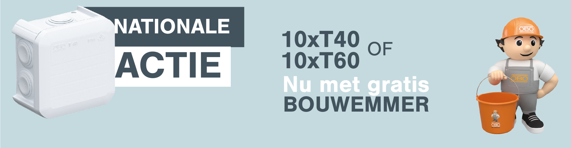 Tijdelijke actie: Koop een gevulde emmer! Ontvang nu een stevige OBO bouwemmer cadeau bij aankoop van 10x T40 of 10x T60 (verpakt in de emmer). Het is de ideale kans om je voorraad aan te vullen met vertrouwde kwaliteit én direct een handig extraatje voor op de klus mee te pakken.