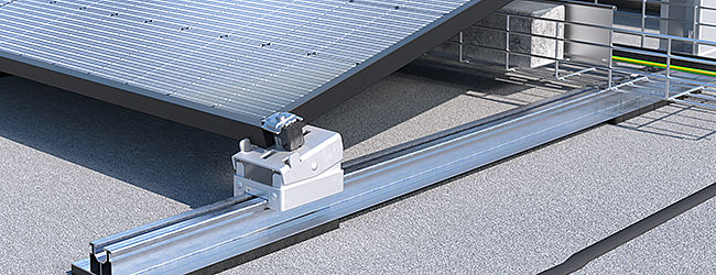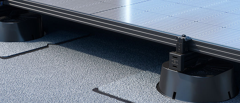 Op platte daken zorgt het Magic PV Flat Pro-systeem niet alleen voor schroefloze en gereedschapsloze montage, maar ook voor flexibele systeemcomponenten en ballastoplossingen via UniBase voor variabele verzwaring van het totale systeem.