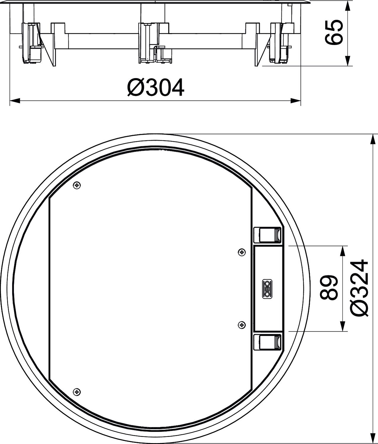 Boîtier de sol avec coulisseau d'arrêt, 3 compartiments, pour la pose des supports de montage MT9. Il est possible d'installer 3 plaques de recouvrement de forme APMT5.