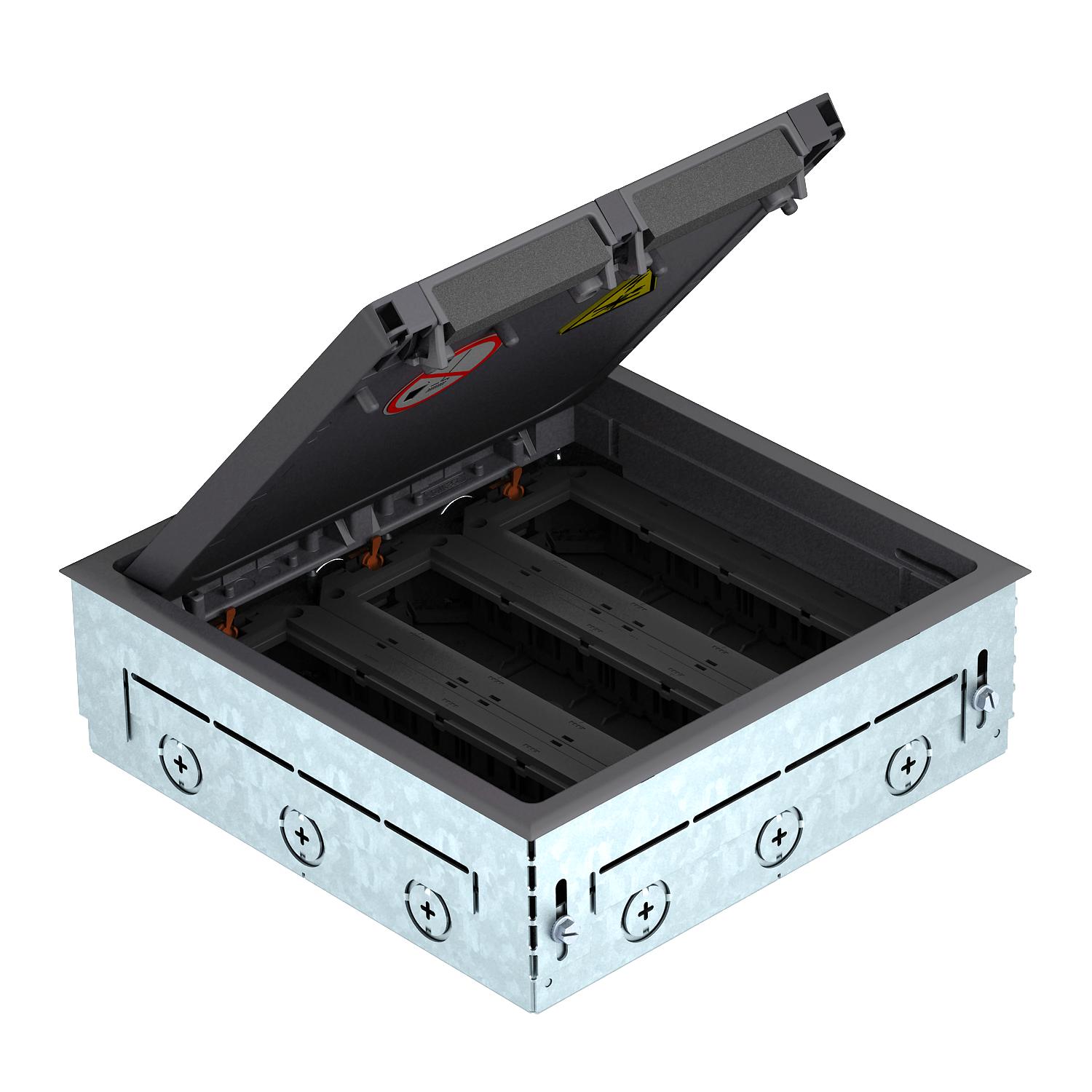 Description du produitBoîte de tirage carrée pour un boîtier de sol GES9 pour installation dans des chapes. Avec ouvertures d'insertion prédécoupées pour canalisations (M25), sur les quatre côtés.