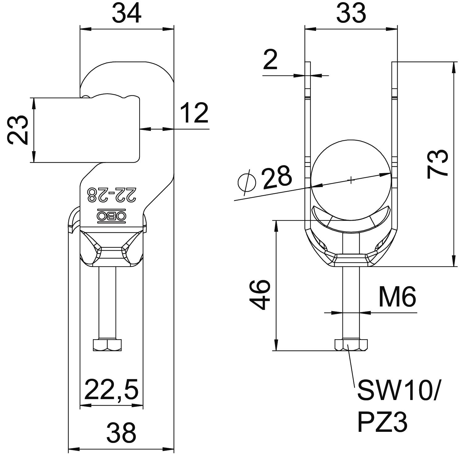 Avec contre-plaque non Avec patin de pression métallique oui Cote A 34 mm Cote B 33 mm Cote C 38 mm Cote L 46 mm Cote t 2 mm Dimension 22-28 Dimension E 12 mm Dimension G (mm) M6 Dimension H 73 mm Empreinte CO2 (GWP) du berceau à la porte 0,2903 kg CO2e / 1 Pièce Épaisseur de tôle 2 mm Filetage M6 Hauteur 73 mm Largeur 33 mm Longueur 33,5 mm Longueur dimension extérieure 38 mm Matériau acier Matériau de la plaque Acier Max. Couple de serrage 3 Nm Nombre de câbles/tubes 1 Ouverture 10 mm Plage de serrage D max. 28 mm Plage de serrage D min. 22 mm pour diamètre de tube max. 28 mm pour diamètre de tube min. 22 mm Sans halogène oui Supplément matériau acier Supplément surface galvanisé à chaud Surface galvanisé à chaud par trempage Type de montage Profilé rond - Tous les types
