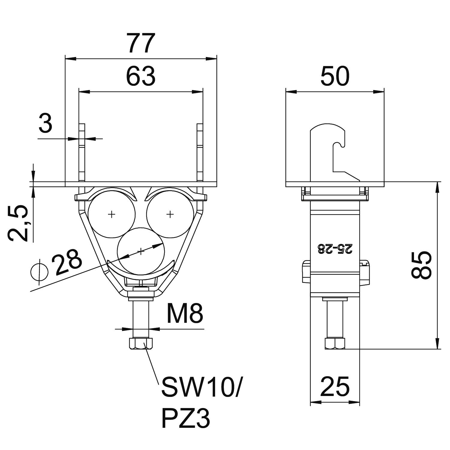 Avec contre-plaque Oui Avec patin de pression en plastique oui Avec patin de pression métallique non Cote A 77 mm Cote B 63 mm Diamètre des câbles max. 28 mm Diamètre des câbles min. 25 mm Dimension 25-28mm Dimension H 101 mm Empreinte CO2 (GWP) du berceau à la porte 0,5142 kg CO2e / 1 Pièce Matériau acier Matériau de la contre-plaque Plastique Matériau de la plaque Plastique Max. Couple de serrage 5 Nm Nombre de câbles/tubes 3 Plage de serrage D max. 28 mm Plage de serrage D min. 25 mm Pour rail avec largeur de fente (avec intervalle) max. 22 mm Pour rail avec largeur de fente (avec intervalle) min. 18 mm Qualité du matériau de la plaque Polypropylène Résistant aux chocs non Sans halogène oui Supplément matériau acier Supplément surface galvanisé à chaud Surface galvanisé à chaud par trempage Type de montage Rail profilé - Tous les types