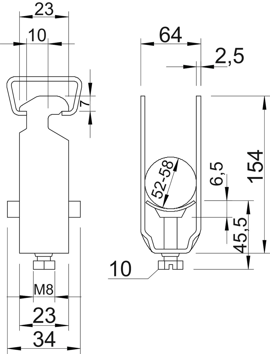 Avec contre-plaque non Avec patin de pression en plastique oui Avec patin de pression métallique non Cote A 23 mm Cote B 64 mm Cote C 40 mm Cote L 45,5 mm Cote t 2,5 mm Cote x 6,5 mm Dimension 52-58mm Dimension G (mm) M8 Dimension H 154 mm Empreinte CO2 (GWP) du berceau à la porte 1,1432 kg CO₂e / 1 Pièce Matériau acier inoxydable 1.4301 Matériau de la plaque Plastique Max. Couple de serrage 5 Nm Nombre de câbles/tubes 2 Plage de serrage D max. 58 mm Plage de serrage D min. 52 mm Pour rail avec largeur de fente (avec intervalle) max. 17 mm Pour rail avec largeur de fente (avec intervalle) min. 16 mm Qualité du matériau de la plaque Polypropylène Résistant aux chocs non Sans halogène oui Supplément matériau acier inoxydable Supplément surface non traité Surface nu, traité Type de montage Rail profilé - Tous les types