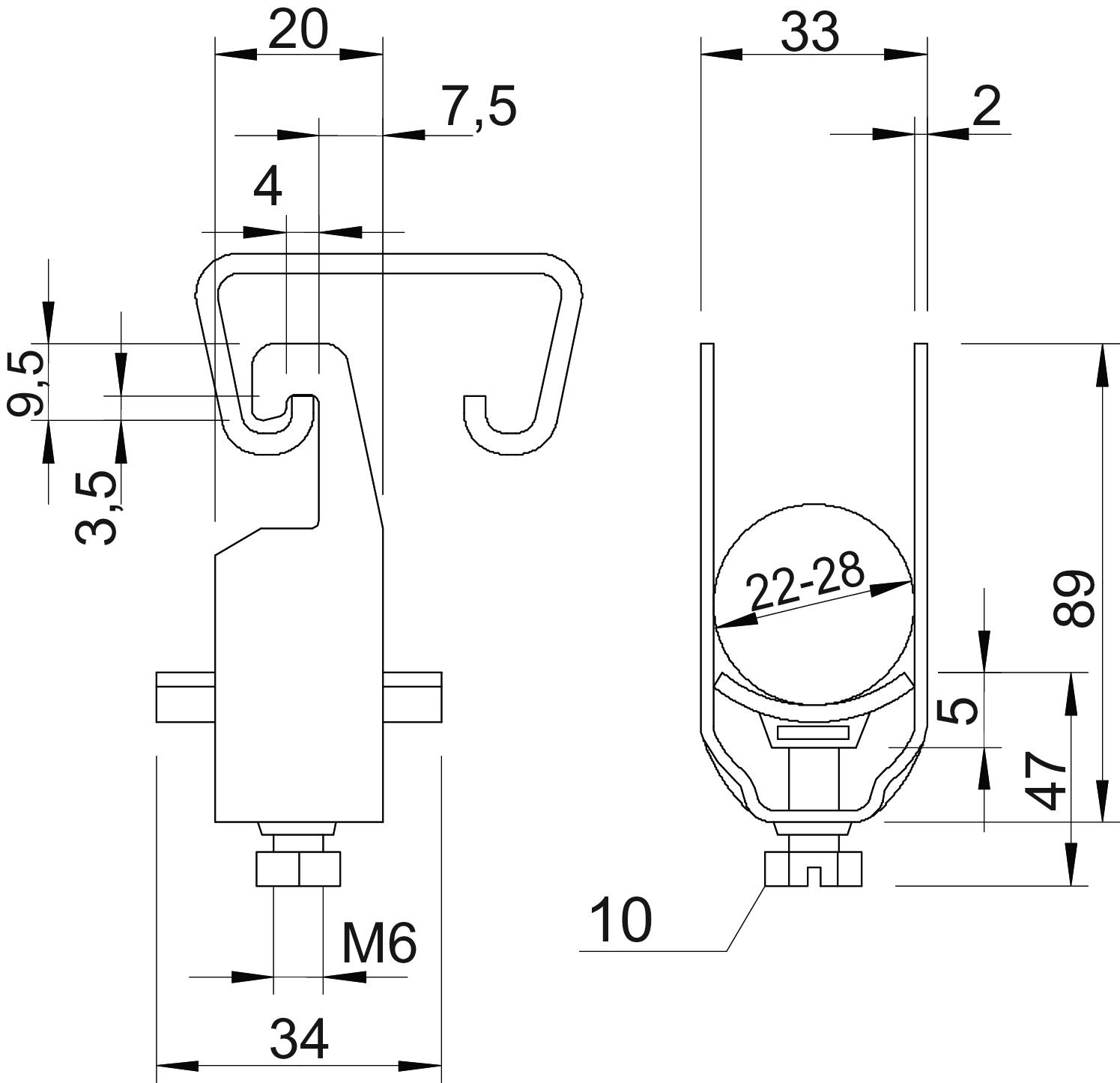 Avec contre-plaque non Avec patin de pression en plastique oui Avec patin de pression métallique non Cote A 20 mm Cote B 33 mm Cote C 34 mm Cote L 47 mm Cote t 2 mm Cote x 5 mm Dimension 22-28mm Dimension G (mm) M6 Dimension H 89 mm Empreinte CO2 (GWP) du berceau à la porte 0,1392 kg CO₂e / 1 Pièce Matériau acier Matériau de la plaque Plastique Max. Couple de serrage 3 Nm Nombre de câbles/tubes 2 Plage de serrage D max. 28 mm Plage de serrage D min. 22 mm pour 1 câble H 59 mm pour 1 câble L 34 pour 2 câbles H 89 mm pour 2 câbles L 47 mm pour 3 câbles H 119 mm pour 3 câbles L 47 mm pour diamètre de tube max. 25 mm pour diamètre de tube min. 25 mm Pour rail avec largeur de fente (avec intervalle) max. 22 mm Pour rail avec largeur de fente (avec intervalle) min. 18 mm Qualité du matériau de la plaque Polypropylène Résistant aux chocs non Sans halogène oui Supplément matériau acier Supplément surface galvanisé à chaud Surface galvanisé à chaud par trempage Type de montage Rail profilé - Tous les types