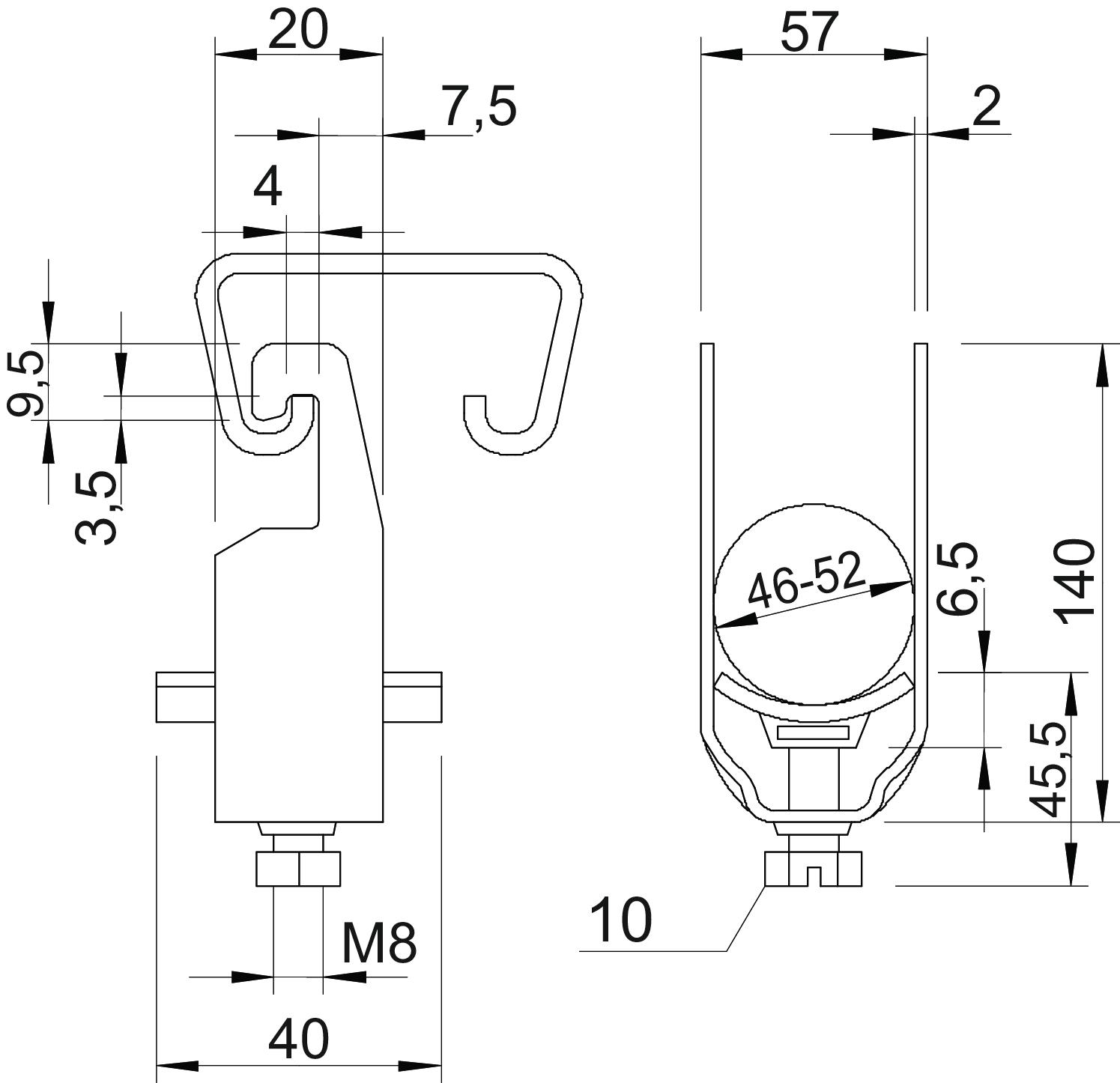 Avec contre-plaque non Avec patin de pression en plastique oui Avec patin de pression métallique non Cote A 23 mm Cote B 57 mm Cote C 40 mm Cote L 45,5 mm Cote t 2 mm Cote x 6,5 mm Dimension 46-52mm Dimension G (mm) M8 Dimension H 140 mm Empreinte CO2 (GWP) du berceau à la porte 0,2898 kg CO₂e / 1 Pièce Matériau acier Matériau de la plaque Plastique Max. Couple de serrage 5 Nm Nombre de câbles/tubes 2 Plage de serrage D max. 52 mm Plage de serrage D min. 46 mm pour 1 câble H 85 mm pour 1 câble L 38,5 pour 2 câbles H 140 mm pour 2 câbles L 45,5 mm pour diamètre de tube max. 50 mm pour diamètre de tube min. 50 mm Pour rail avec largeur de fente (avec intervalle) max. 22 mm Pour rail avec largeur de fente (avec intervalle) min. 18 mm Qualité du matériau de la plaque Polypropylène Résistant aux chocs non Sans halogène oui Supplément matériau acier Supplément surface galvanisé à chaud Surface galvanisé à chaud par trempage Type de montage Rail profilé - Tous les types