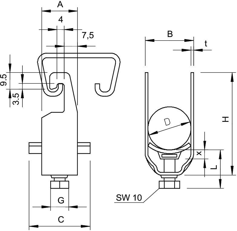 Avec contre-plaque non Avec patin de pression en plastique oui Avec patin de pression métallique non Cote A 23 mm Cote B 76 mm Cote C 40 mm Cote L 38,5 mm Cote t 2,5 mm Cote x 6,5 mm Dimension 64-70mm Dimension G (mm) M8 Dimension H 103 mm Empreinte CO2 (GWP) du berceau à la porte 0,6465 kg CO₂e / 1 Pièce Matériau acier inoxydable 1.4301 Matériau de la plaque Plastique Max. Couple de serrage 5 Nm Nombre de câbles/tubes 1 Plage de serrage D max. 70 mm Plage de serrage D min. 64 mm pour 1 câble H 103 mm pour 1 câble L 38,5 Pour rail avec largeur de fente (avec intervalle) max. 22 mm Pour rail avec largeur de fente (avec intervalle) min. 18 mm Qualité du matériau de la plaque Polypropylène Résistant aux chocs non Sans halogène oui Supplément matériau acier inoxydable Supplément surface non traité Surface nu, traité Type de montage Rail profilé - Tous les types