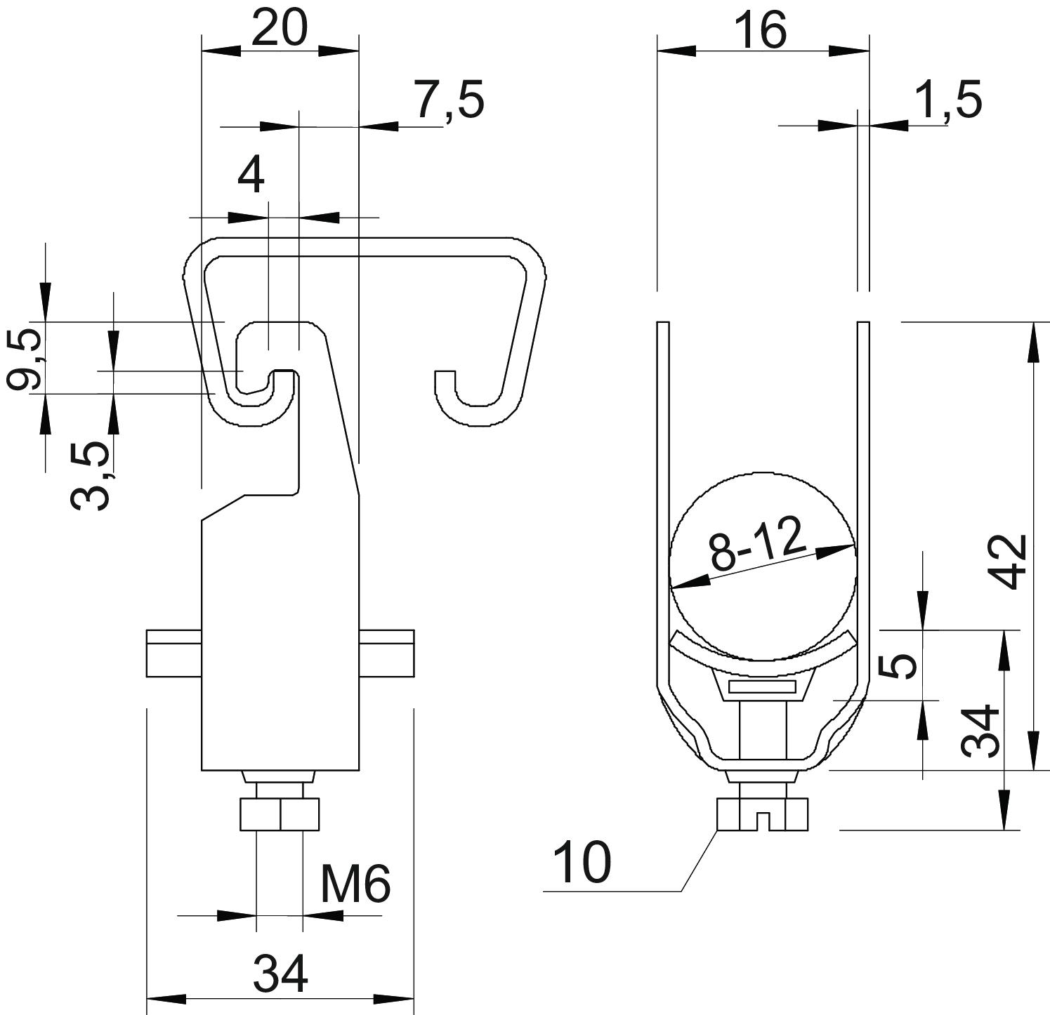 Avec contre-plaque non Avec patin de pression en plastique oui Avec patin de pression métallique non Cote A 20 mm Cote B 16 mm Cote C 34 mm Cote L 34 mm Cote t 1,5 mm Cote x 5 mm Dimension 8-12mm Dimension G (mm) M6 Dimension H 42 mm Empreinte CO2 (GWP) du berceau à la porte 0,1706 kg CO₂e / 1 Pièce Matériau acier inoxydable 1.4301 Matériau de la plaque Plastique Max. Couple de serrage 3 Nm Nombre de câbles/tubes 1 Plage de serrage D max. 12 mm Plage de serrage D min. 8 mm pour 1 câble H 42 mm pour 1 câble L 34 Pour rail avec largeur de fente (avec intervalle) max. 22 mm Pour rail avec largeur de fente (avec intervalle) min. 18 mm Qualité du matériau de la plaque Polypropylène Résistant aux chocs non Sans halogène oui Supplément matériau acier inoxydable Supplément surface non traité Surface nu, traité Type de montage Rail profilé - Tous les types