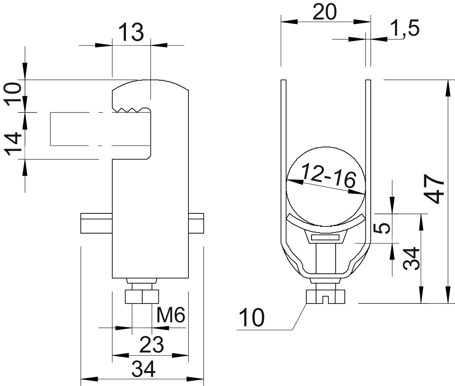 Avec contre-plaque non Avec patin de pression en plastique oui Avec patin de pression métallique non Cote A 23 mm Cote B 20 mm Cote C 34 mm Cote L 34 mm Cote t 1,5 mm Cote x 5 mm Dimension 12-16mm Dimension E 13 mm Dimension G (mm) M6 Dimension H 47 mm Empreinte CO2 (GWP) du berceau à la porte 0,0773 kg CO₂e / 1 Pièce Matériau acier Matériau de la plaque Plastique Max. Couple de serrage 3 Nm Nombre de câbles/tubes 1 Plage de serrage D max. 16 mm Plage de serrage D min. 12 mm pour 1 câble H 47 mm pour 1 câble L 34 pour 2 câbles H 65 mm pour 2 câbles L 34 mm pour 3 câbles H 83 mm pour 3 câbles L 47 mm pour diamètre de tube max. 16 mm pour diamètre de tube min. 16 mm Qualité du matériau de la plaque Polypropylène Résistant aux chocs non Sans halogène oui Supplément matériau acier Supplément surface galvanisé à chaud Surface galvanisé à chaud par trempage Type de montage Profilé plat - Tous les types