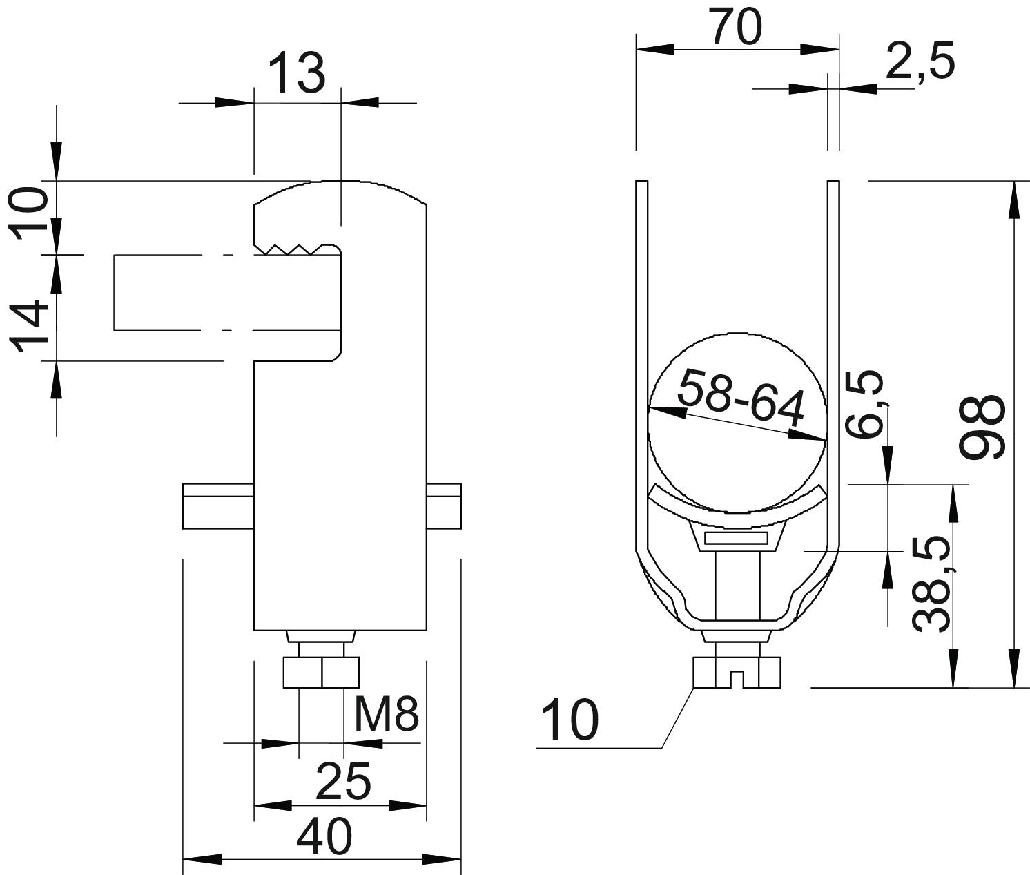 Avec contre-plaque non Avec patin de pression en plastique oui Avec patin de pression métallique non Cote A 25 mm Cote B 70 mm Cote C 40 mm Cote L 38,5 mm Cote t 2,5 mm Cote x 6,5 mm Dimension 58-64mm Dimension E 13 mm Dimension G (mm) M8 Dimension H 98 mm Empreinte CO2 (GWP) du berceau à la porte 0,2644 kg CO₂e / 1 Pièce Matériau acier Matériau de la plaque Plastique Max. Couple de serrage 5 Nm Nombre de câbles/tubes 1 Plage de serrage D max. 64 mm Plage de serrage D min. 58 mm pour 1 câble H 98 mm pour 1 câble L 38,5 pour diamètre de tube max. 63 mm pour diamètre de tube min. 63 mm Qualité du matériau de la plaque Polypropylène Résistant aux chocs non Sans halogène oui Supplément matériau acier Supplément surface galvanisé à chaud Surface galvanisé à chaud par trempage Type de montage Profilé plat - Tous les types