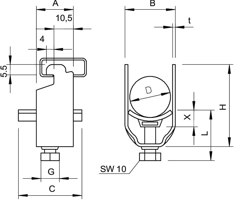 Avec contre-plaque non Avec patin de pression en plastique non Avec patin de pression métallique oui Cote A 23 mm Cote B 64 mm Cote C 35 mm Cote L 37 mm Cote t 2,5 mm Cote x 5 mm Dimension 52-58mm Dimension G (mm) M8 Dimension H 89 mm Empreinte CO2 (GWP) du berceau à la porte 0,251 kg CO₂e / 1 Pièce Matériau acier Matériau de la plaque Acier Max. Couple de serrage 5 Nm Nombre de câbles/tubes 1 Plage de serrage D max. 58 mm Plage de serrage D min. 52 mm pour 1 câble H 86 mm pour 1 câble L 44 pour 2 câbles H 150 mm pour 2 câbles L 56 mm pour diamètre de tube max. 50 mm pour diamètre de tube min. 50 mm Pour rail avec largeur de fente (avec intervalle) max. 12 mm Pour rail avec largeur de fente (avec intervalle) min. 11 mm Résistant aux chocs non Sans halogène non Supplément matériau acier Supplément surface galvanisé à chaud Surface galvanisé à chaud par trempage Type de montage Rail profilé - Tous les types