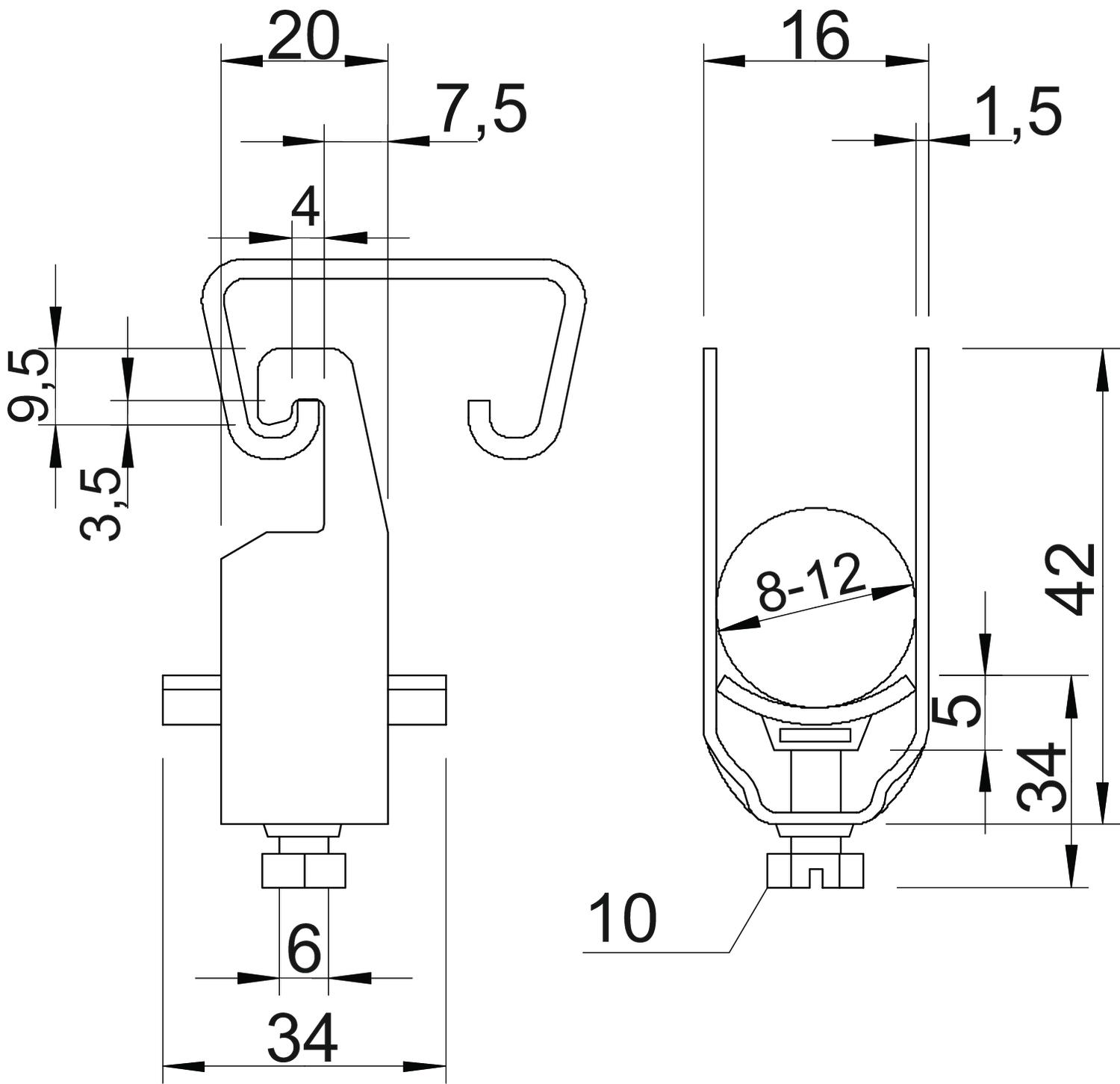 Avec contre-plaque non Avec patin de pression en plastique non Avec patin de pression métallique oui Cote A 20 mm Cote B 16 mm Cote C 34 mm Cote L 34 mm Cote t 1,5 mm Cote x 5 mm Dimension 8-12mm Dimension G (mm) M6 Dimension H 42 mm Empreinte CO2 (GWP) du berceau à la porte 0,0605 kg CO₂e / 1 Pièce Matériau acier Matériau de la plaque Acier Max. Couple de serrage 3 Nm Nombre de câbles/tubes 1 Plage de serrage D max. 12 mm Plage de serrage D min. 8 mm Pour rail avec largeur de fente (avec intervalle) max. 22 mm Pour rail avec largeur de fente (avec intervalle) min. 18 mm Résistant aux chocs non Sans halogène non Supplément matériau acier Supplément surface galvanisé à chaud Surface galvanisé à chaud par trempage Type de montage Rail profilé - Tous les types