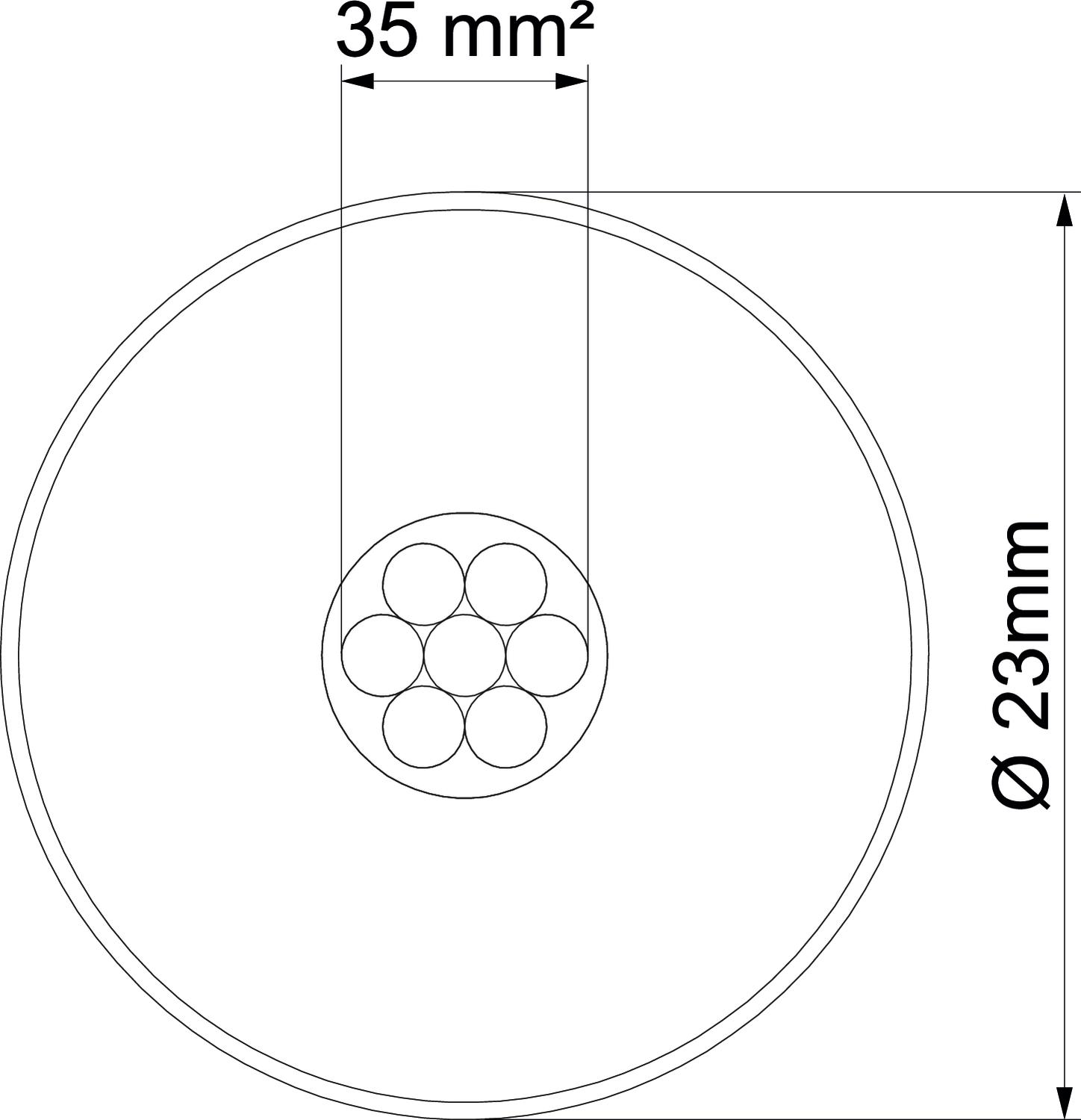 Bague normale (env. m) 100 Coloris noir Diamètre 23 mm Dimension Ø23mm Distance de séparation équivalente s(e)/m 0,9 Enveloppe du matériau EVA Length tolerance ± 5 % Modèle isolé haute tension oui Nombre de fils individuels 7 Propriété du matériau autres Section 35 mm² - Tous les types
