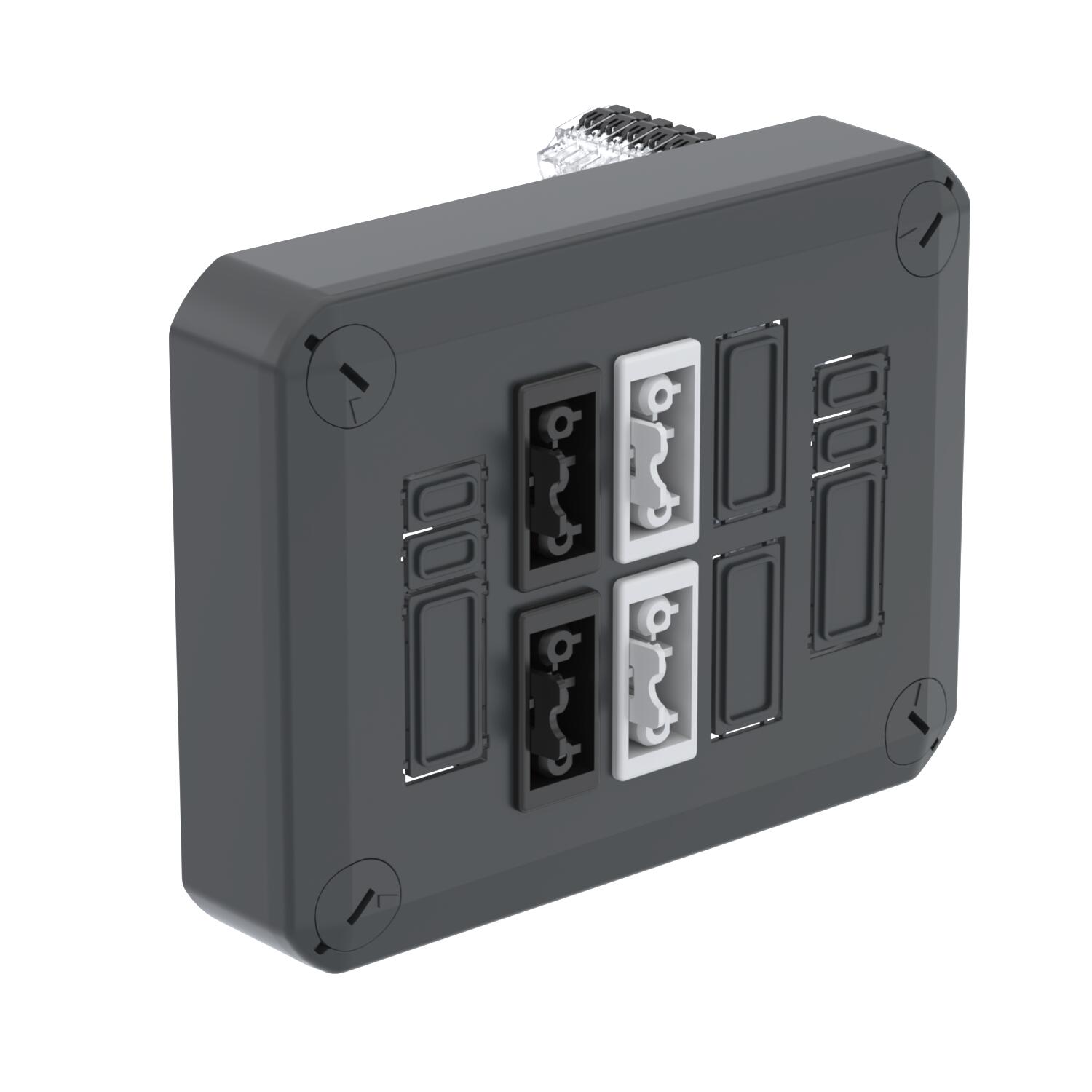 Couvercle enfichable pour l’obturation de boîtes de dérivation, équipé de 2 à 6 systèmes enfichables Wieland GST18, précâblé avec bornes à levier. Couvercle avec fermeture rapide, plombable. Matériau sans halogène, résistant aux UV. Ignifugé selon DIN EN 60695-2-11, Température d’essai 650 °C. Résistance à la frappe IK07 à température ambiante. Indice de protection IP30.