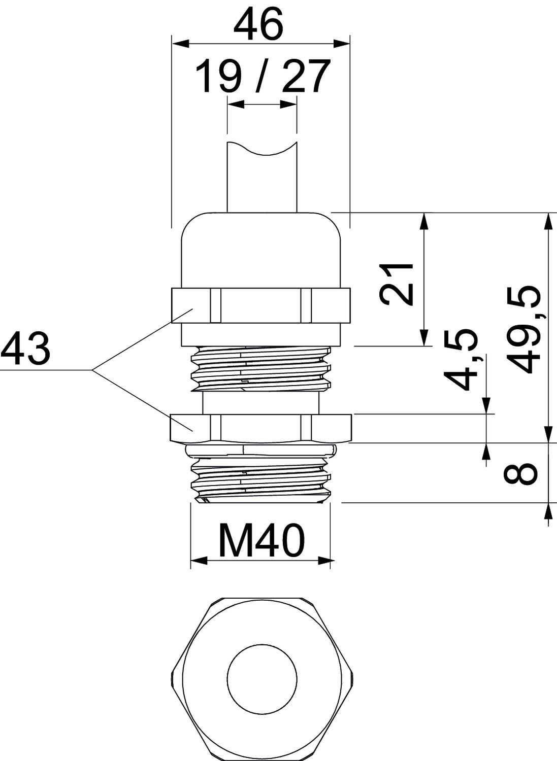 Avec contre-écrou non Bague d'étanchéité multiple non Capacité d’étanchéité D max. 27 mm Capacité d’étanchéité D min. 19 mm Cote L1 8 mm Cote L2 4,5 mm Cote L3 21 mm Couple de serrage instable 13,5 Nm Dimension M40 Dimension E 46 mm Dimension L max. 49,5 mm Empreinte CO2 (GWP) du berceau à la porte 0,3351 kg CO2e / 1 Pièce Filetage M40 x 1,5 Indice de protection IP68 Longueur du filetage 8 mm Matériau laiton Modèle droit Ouverture de clé 43 Plage de températures d’utilisation max. 100 °C Plage de températures d’utilisation min. -20 °C Possibilité de décharge de traction oui Pour zone explosive sans Presse-étoupe pour câbles plats non Protection antiflexion non Renforcé de fibres de verre non Résistant aux chocs non Sans halogène non Surface nickelé Type d'étanchéité Bague d'étanchéité Type de filetage métrique - Tous les types