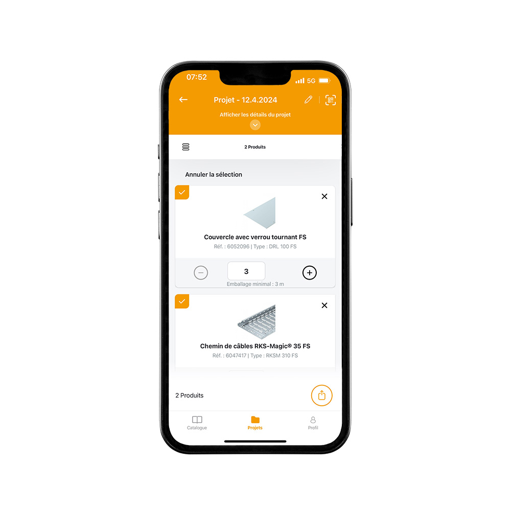 Créez vos propres projets et ajoutez simplement des produits choisis dans le catalogue OBO. D’un seul clic, vous pouvez exporter vos projets au format CSV. Une liste de références est automatiquement créée pour chaque projet :