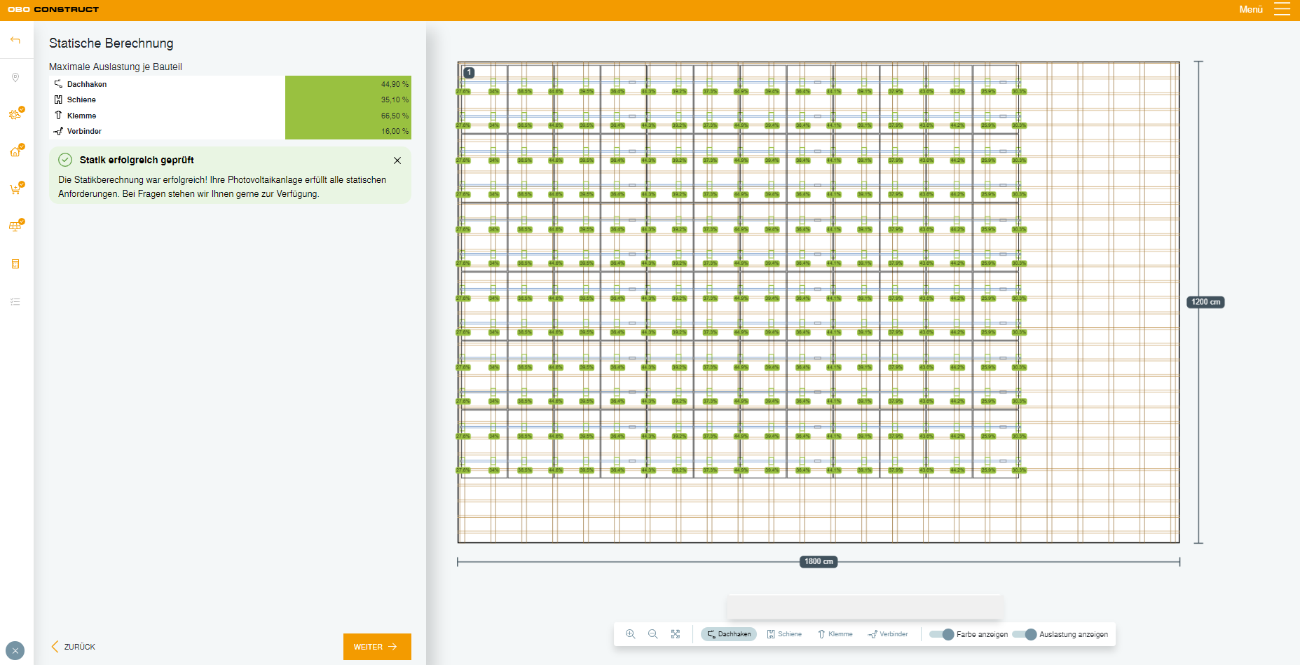 Créez votre projet photovoltaïque en ligne, modifiez-le et enregistrez votre planification. Notre outil calcule automatiquement les quantités nécessaires pour chaque composant et génère ensuite un schéma des structures porteuses et des modules en se basant sur votre planification. Téléchargez ce schéma ainsi que les textes d’appels d’offres et les calculs statiques de la structure en toute simplicité dans le format de fichier de votre choix.