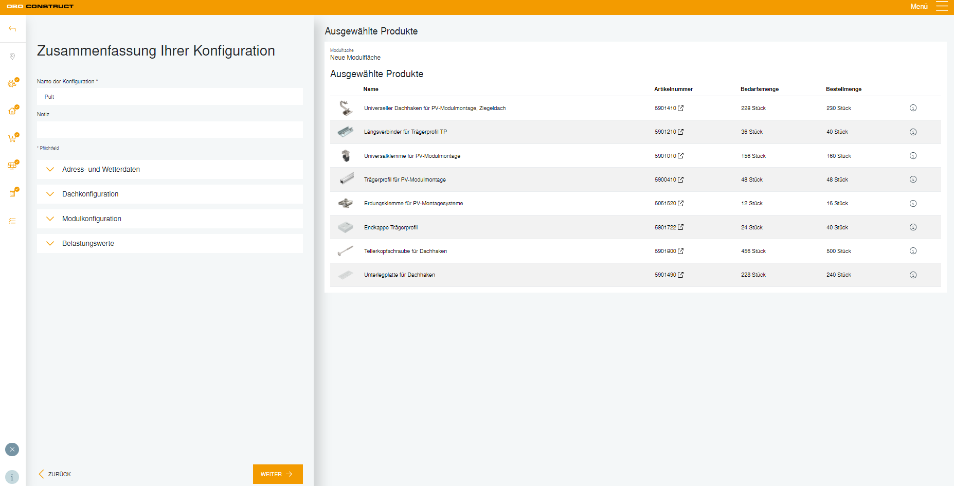Le futur de la planification photovoltaïquePlanifier des systèmes de montage d’installations photovoltaïques n’a jamais été aussi simple grâce à l’outil OBO Construct Tool dédié pour Magic PV Solution. Cet outil de planification intuitif et facile d’utilisation se distingue par des processus de planification courts. Il vous guidera pas à pas pour trouver le système de montage photovoltaïque OBO adapté à vos besoins, répondant à vos exigences et à vos attentes.
