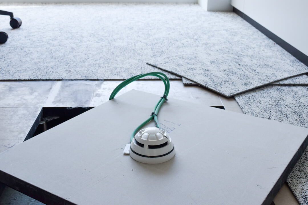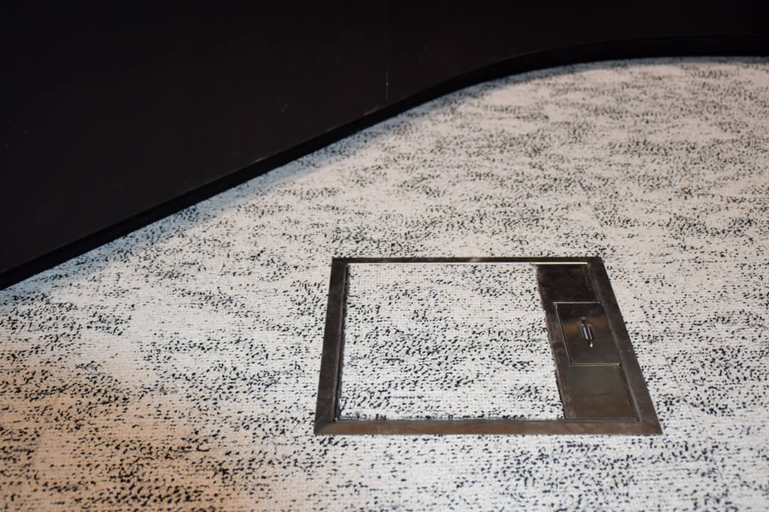 Les systèmes sous chape d’OBO ont été utilisés d’une manière bien singulière lors de ce projet : les couvercles des boîtiers de sol GES9M-2 ont été utilisés comme points d’accès pour le test et la maintenance des détecteurs de fumées sous chape. L’objectif était d’utiliser le moins de plastique possible dans ce bâtiment, c’est pourquoi le choix s’est porté sur la version en acier inoxydable des solutions sous chape d’OBO. Pour faciliter l’installation, les cotes précises de l’ouverture ont été découpées au jet d’eau dans le carrelage.