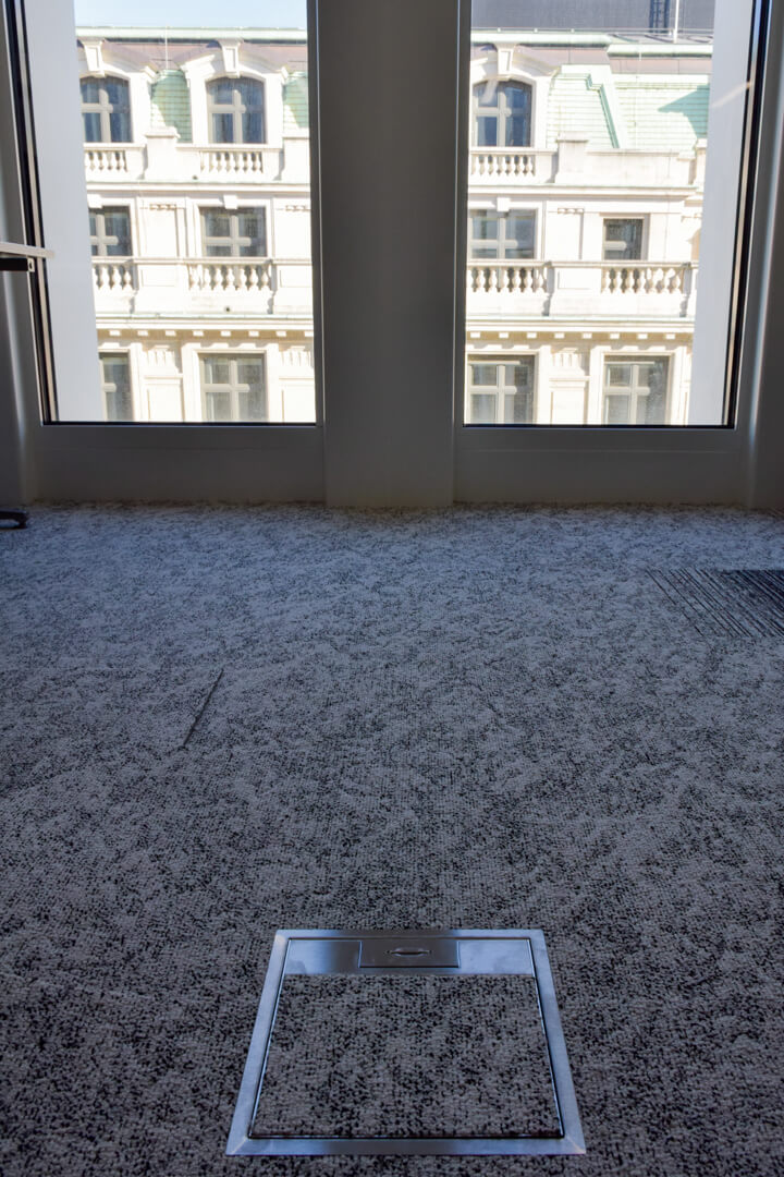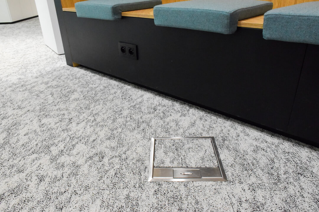 Les solutions de différents fabricants ont été testées pour l’installation sous chape. Le choix s’est porté sur OBO, car les solutions proposées par OBO ont su convaincre avec leur profil de bordure mince. Les couvercles ont ainsi pu être intégrés encore plus facilement dans les moquettes posées dans le bâtiment. Les cassettes d’OBO convainquent par leur design discret et élégant. Une fois installées, elles ne sont presque plus visibles pour ne pas perturber l’apparence de la pièce.
