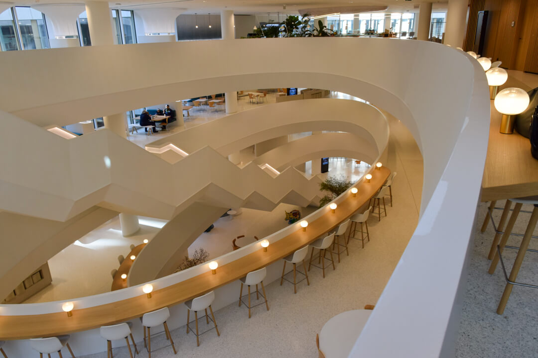 Une grande importance a été accordée à la construction durable de ce bâtiment. Il compte en tout 100 000 mètres carrés, répartis sur 10 étages en surface et 5 étages souterrains. Des panneaux solaires ont été installés sur le toit, l’eau de pluie est récupérée et réutilisée et la cave comporte un réservoir d’énergie thermique. Un parking pour 330 vélos et 160 bornes de recharge pour voitures électriques facilitent le trajet des employés vers leur lieu de travail tout en respectant l’environnement.
