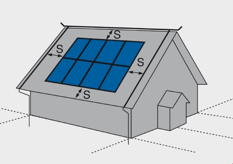 L'installation de protection contre la foudre doit être établie selon la norme DIN EN 62305 avec la distance de séparation (s) par rapport aux éléments de l'installation photovoltaïque. En règle générale, une distance de séparation (s) = distance de sécurité de 0,5 m à 1 m est suffisante.