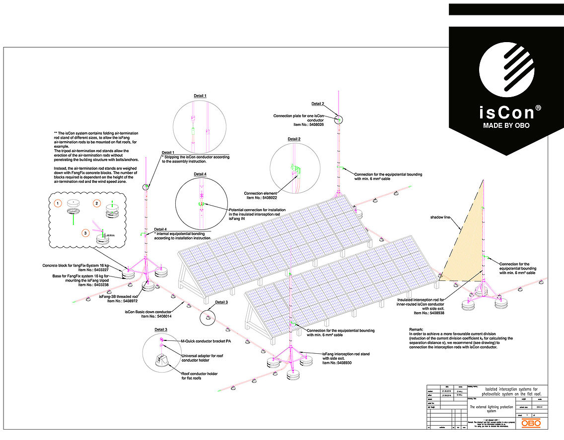 Positionner les mâts de capture ou les tiges de capture de sorte à éviter une ombre sur les modules photovoltaïques. Un seul noyau d’ombre suffit à provoquer une perte de performance sur toute la chaîne photovoltaïque. Conformément à VDE 0185-305-3, annexe 5, une tige doit être positionnée à une distance minimum de 108 x son diamètre du module PV. Noter néanmoins que le système photovoltaïque doit être situé dans la zone de protection des tiges de capture. Avec le système isolé et résistant à la haute tension isCon® d’OBO, la distance de séparation peut être respectée de manière fiable.
