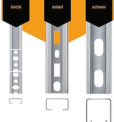 Naast de drie belastingklassen licht, middel en zwaar staan voor installateurs de rails bovendien in verschillende materiaaldiktes ter beschikking. Een uitgebreide keuze aan gatenpatronen, altijd precies passend voor de betreffende toepassing, rondt het portfolio af. Nog een voordeel: overeenkomstig de gebruikslocatie is het railassortiment leverbaar in de oppervlakken bandverzinkt en thermisch verzinkt en in de RVS-kwaliteiten A2 en A4.