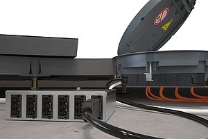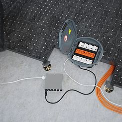 From energy distribution through to device connection: The electrical supply can be connected directly, from the Consolidation Point in the base through to the socket. Here, the energy distributors are mounted at central points under the floor surfaces and supply the installed floor boxes, cassettes and service outlets in a star shape. The plug-in installation can be carried through directly to the socket using the preconfigured universal supports. The corresponding installation accessories include, amongst other things, the connection cables.