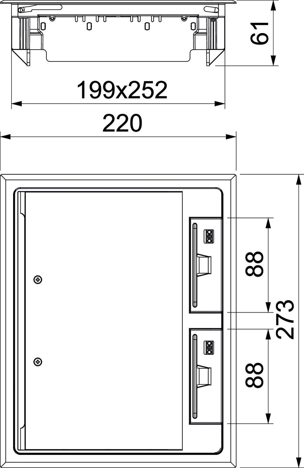 ProductbeschrijvingKlapdeksel voor 6 inbouwapparaten in 3 apparatuurdozen UT voor toepassing in verhoogde vloeren binnenshuis. De bevestigingsbeugels hebben een spanbereik tot 50 mm plaatdikte.