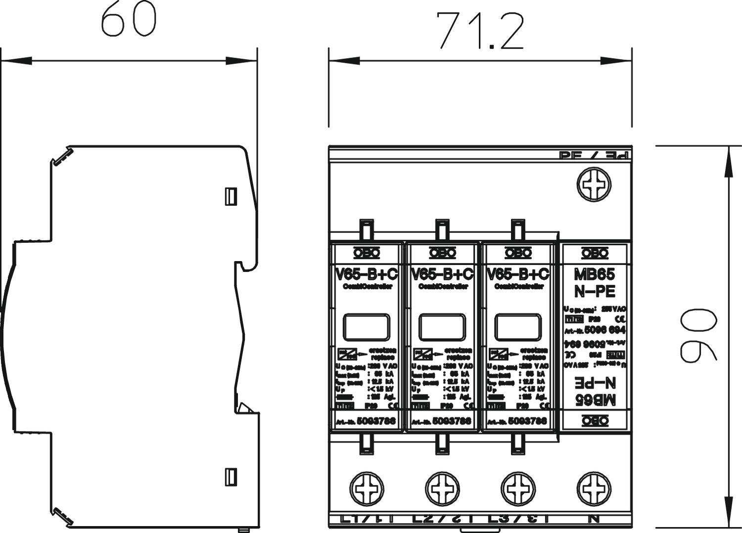 • Bliksemstroomafleidvermogen 12,5 kA (10/350) per fase en 65 kA (8/20) totaal