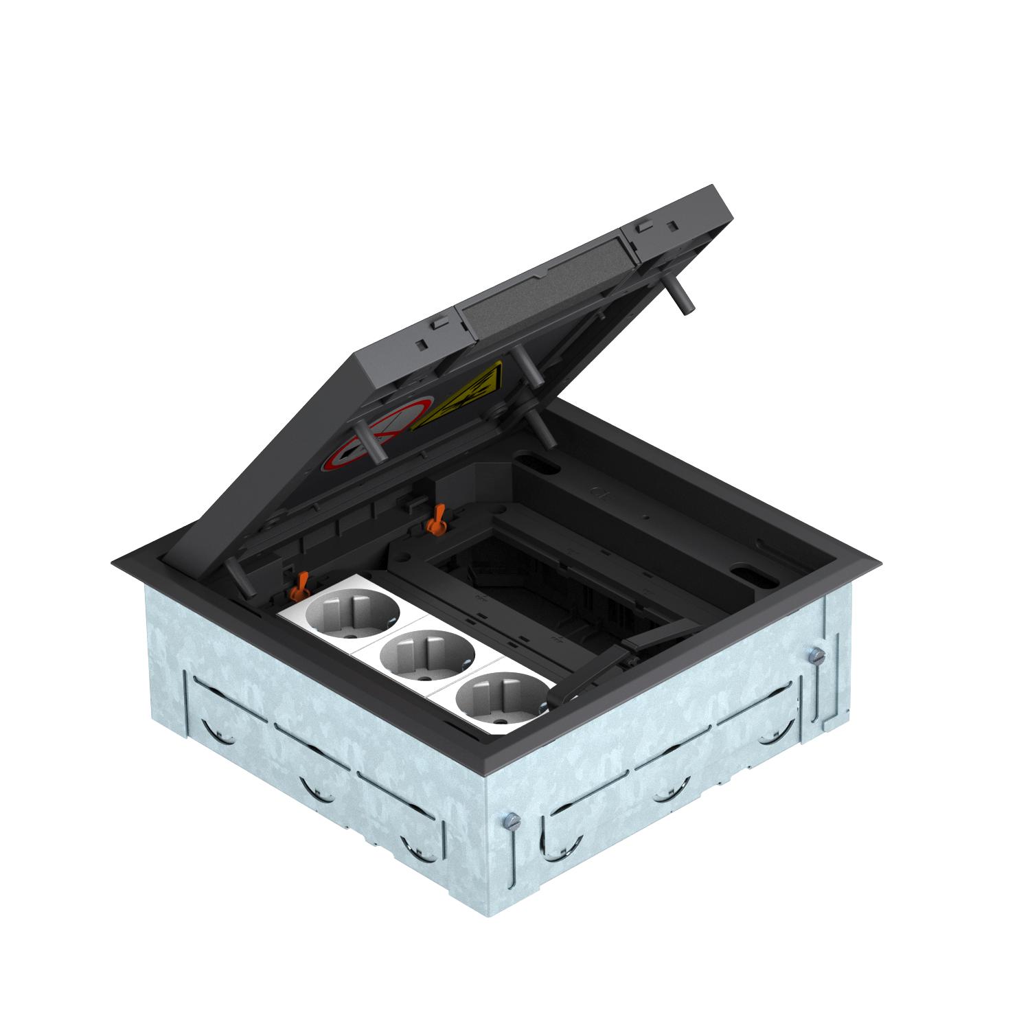 ProductbeschrijvingVierkante inbouweenheid voor zes installatie-apparaten Module 45, voor gebruik in droog onderhouden holle vloeren en dekvloeren in binnenopstelling die bestaan uit inbouwdoos, apparatuurdoos GES4-2, twee universele dragers UT en een 3-voudige contactdoos met randaarde 33°, in wit. Inbouwbehuizing met voorgeperste invoeropeningen voor buizen (M25), in te stellen op bovenkant dekvloer. Bij de levering is de inbouwbehuizing met een blinddeksel afgesloten. De apparatuurdoos kan na dekvloerwerkzaamheden in de ontstane montageopening worden geplaatst. Uitsparing voor vloerbekleding in het klapdeksel 3, 5, 8 of 10 mm.