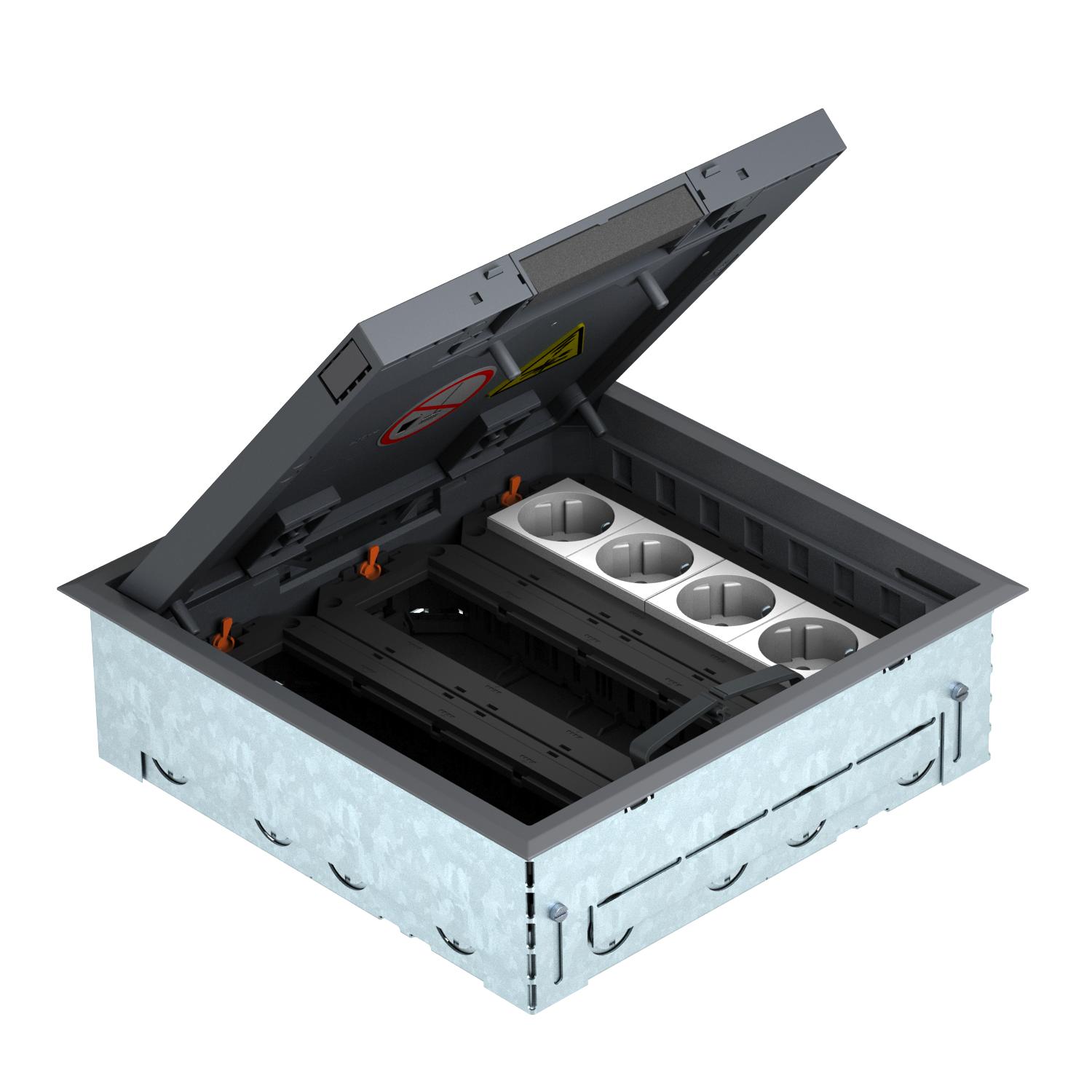 ProductbeschrijvingVierkant vloerdoos voor twaalf installatie-apparaten Module 45, voor gebruik in droog onderhouden holle vloeren en dekvloeren in binnenopstelling die bestaan uit inbouwdoos, klapdeksel GES9-2, drie apparatuurdozen UT en twee 2-voudige stopcontacten met randaarde 33°, in wit. Inbouwbehuizing met voorgeperste invoeropeningen voor buizen (M25), in te stellen op bovenkant dekvloer. Bij de levering is de inbouwbehuizing met een blinddeksel afgesloten. Het klapdeksel kan na dekvloerwerkzaamheden in de ontstane montageopening worden geplaatst. Uitsparing voor vloerbekleding in het klapdeksel 3, 5, 8 of 10 mm.