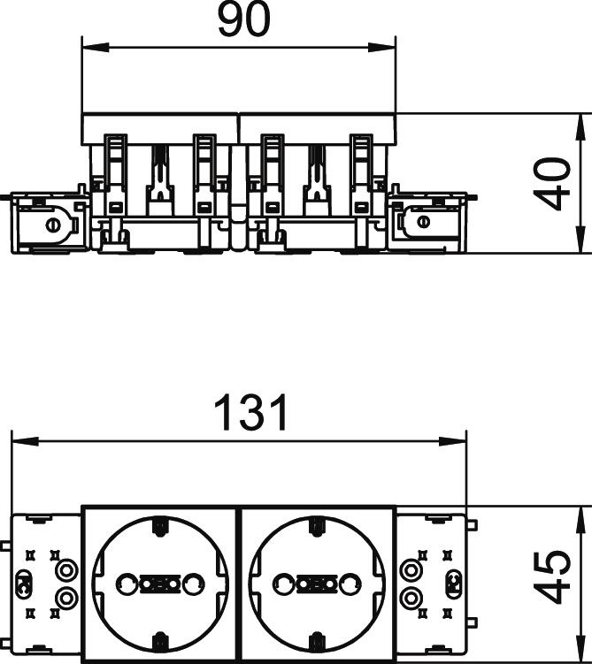 ProductbeschrijvingContactdoos met randaarde met zijaansluiting 2-voudig 0°, met verhoogde aanrakingsbeveiliging, met steekklemmen, 2-polig, 16A, 250V~, met verbindingsklemmen conform IEC 60884-1 geschikt voor de inbouw in installatiekanaalsystemen Rapid 45.