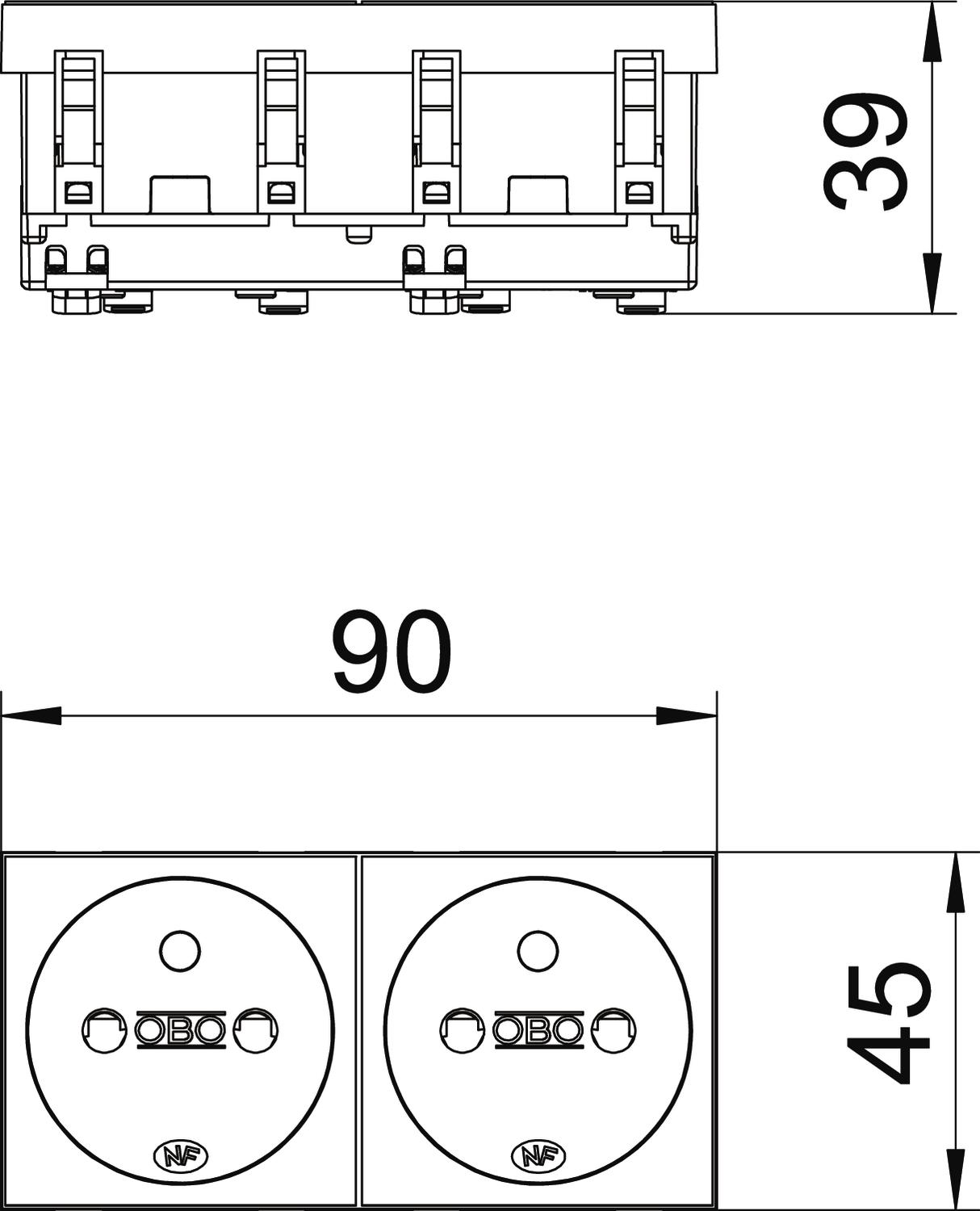 ProductbeschrijvingContactdoos met aardpen 2-voudig 0°, met verhoogde aanrakingsbeveiliging, met steekklemmen, 2-polig, 16A, 250V~, met verbindingsklemmen conform IEC 60884-1.