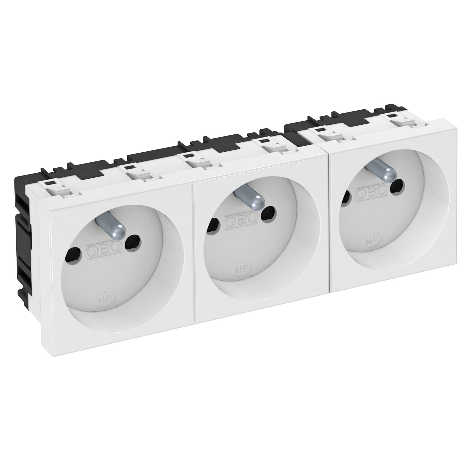 ProductbeschrijvingContactdoos met aardpen 3-voudig 0°, met verhoogde aanrakingsbeveiliging, met steekklemmen, 2-polig, 16A, 250V~, met verbindingsklemmen conform IEC 60884-1.
