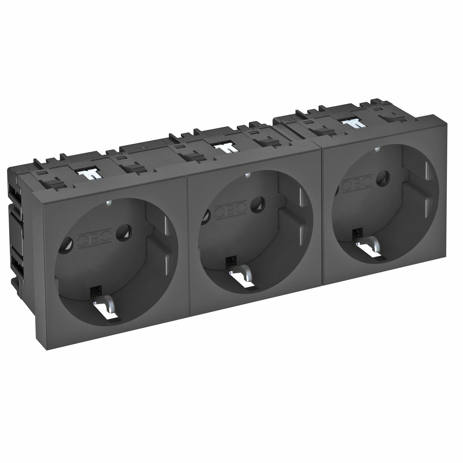 ProductbeschrijvingStopcontact met randaarde, drievoudig 0°, met verhoogde aanrakingsbeveiliging, met schroefloze klemmen, 2-polig, 16 A, 250 V~, met aansluitklemmen volgens IEC 60884-1.