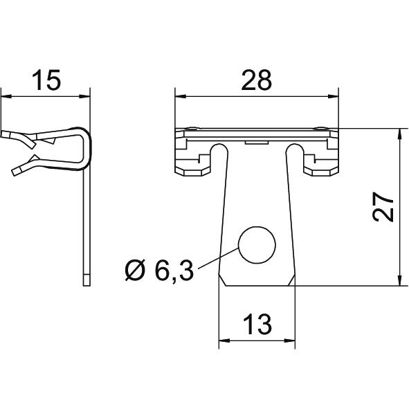 Aansluittype/-component Gat bevestigingsgat 6,5 mm Breedte 28 mm Breukbelasting 0,45 kN Dimensie 1,5-4mm Dimension W 28 mm Flensdikte F max. 4 mm Flensdikte F min. 1,5 mm Hoogte 15 mm Kleur zink Lengte 27 mm Maat L 27 mm Materiaal staal Oppervlak Zinklamel Scharnier instelbaar nee Scharnierend nee Type bevestiging klemmen - Alle typen