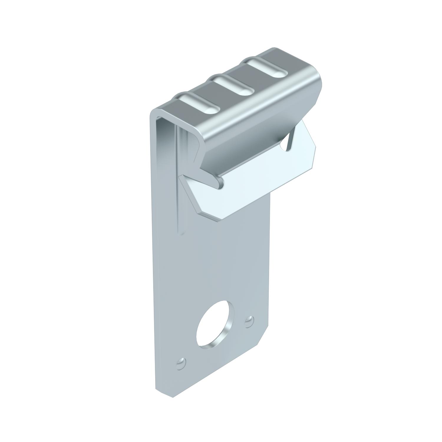 ProductbeschrijvingDraagklem met boring voor individuele montage-oplossingen, bijv. voor de bevestiging van S-haken of kettingen. Bevestiging op stalen dragers door opslaan.