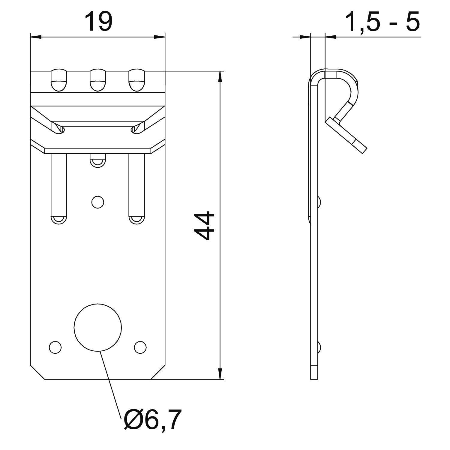 Aansluittype/-component Gat Breedte 19 mm Breukbelasting 0,72 kN Dimensie 1,5-5mm Flensdikte F max. 5 mm Flensdikte F min. 1,5 mm Hoogte 8 mm Kleur zink Lengte 44 mm Materiaal staal Oppervlak Zinklamel Scharnier instelbaar nee Scharnierend nee Type bevestiging klemmen - Alle typen