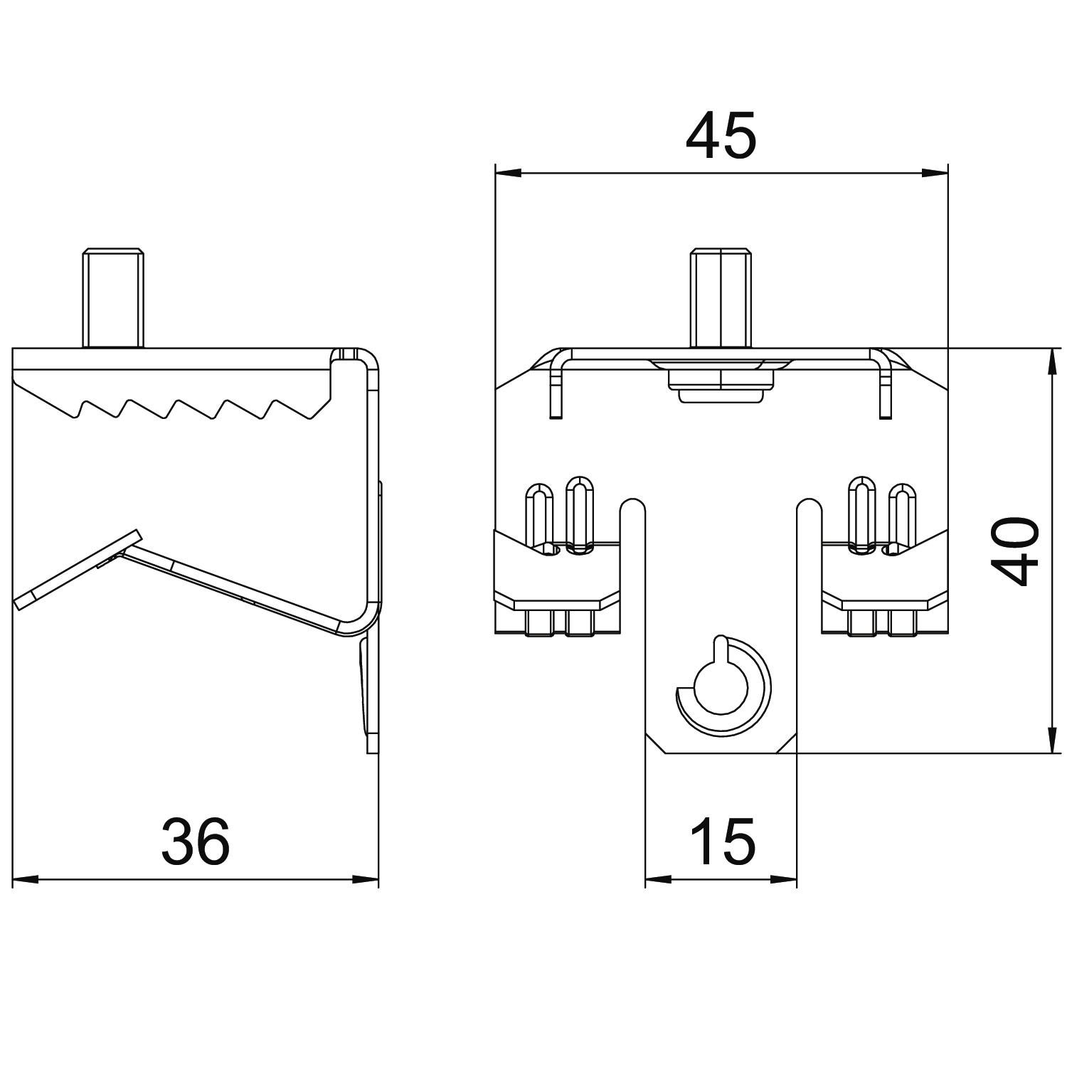 Aansluittype/-component Schroefdraad Breedte 45 mm Breukbelasting 0,45 kN Dimensie 14-20mm Flensdikte F max. 20 mm Flensdikte F min. 14 mm Hoogte 36 mm Kleur zink Lengte 40 mm Maat L 40 mm Materiaal staal Oppervlak Zinklamel Scharnier instelbaar nee Scharnierend nee Schroefdraad M6 x 9 mm Schroefdraad metrisch 6 Type bevestiging klemmen - Alle typen