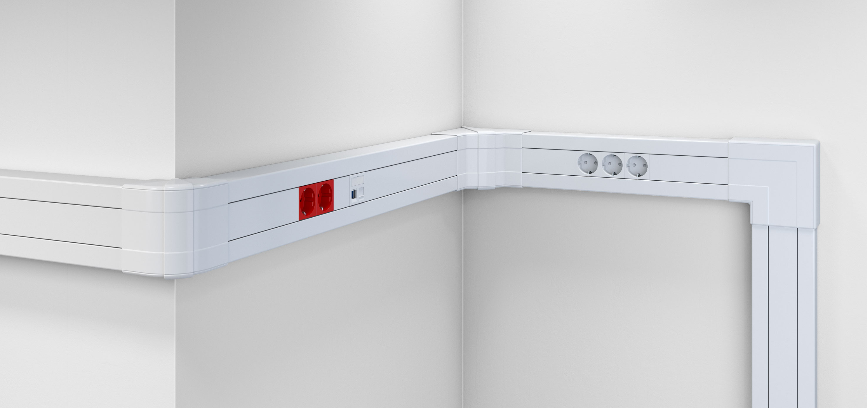 De Rapid 45-2 installatiekanalen van kunststof hebben dezelfde afmetingen als de aluminium uitvoering. Door de consequente standaardisatie wordt het combineren van afzonderlijke systeemdelen vereenvoudigd. Zo passen toebehoren, zoals eindstukken of variabele vormstukken, zowel op de kunststof als de aluminium kanalen.