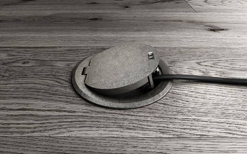 De borgfunctie van het klapdeksel maakt een betrouwbare uitlaat voor de kabelinstallatie mogelijk. In gesloten toestand kan de vloercontactdoos zelfs nat worden onderhouden. Deze uitvoering van de GES R2 is leverbaar in de kleuren oudmessing, oudkoper, chroom, nikkel, nikkel-geoxideerd en diepzwart.