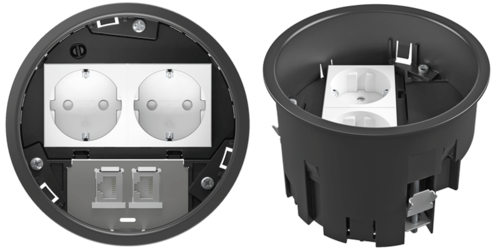 De installatiedoos is leeg of uitgerust leverbaar. De voorgemonteerde versie bevat een 2-voudige contactdoos of een vrij te kiezen combinatie van twee Module 45-apparaten. De met de 2-voudige contactdoos voorgemonteerde installatiedoos is bijzonder goed geschikt voor standaardtoepassingen. Een variant voor twee Module 45-apparaten biedt nog meer inbouwflexibiliteit: de installatieruimte is in deze variant gescheiden. Dat maakt de gelijktijdige inbouw mogelijk van twee contactdozen en twee multimedia-aansluitingen zoals HDMI, VGA of datatechniek.