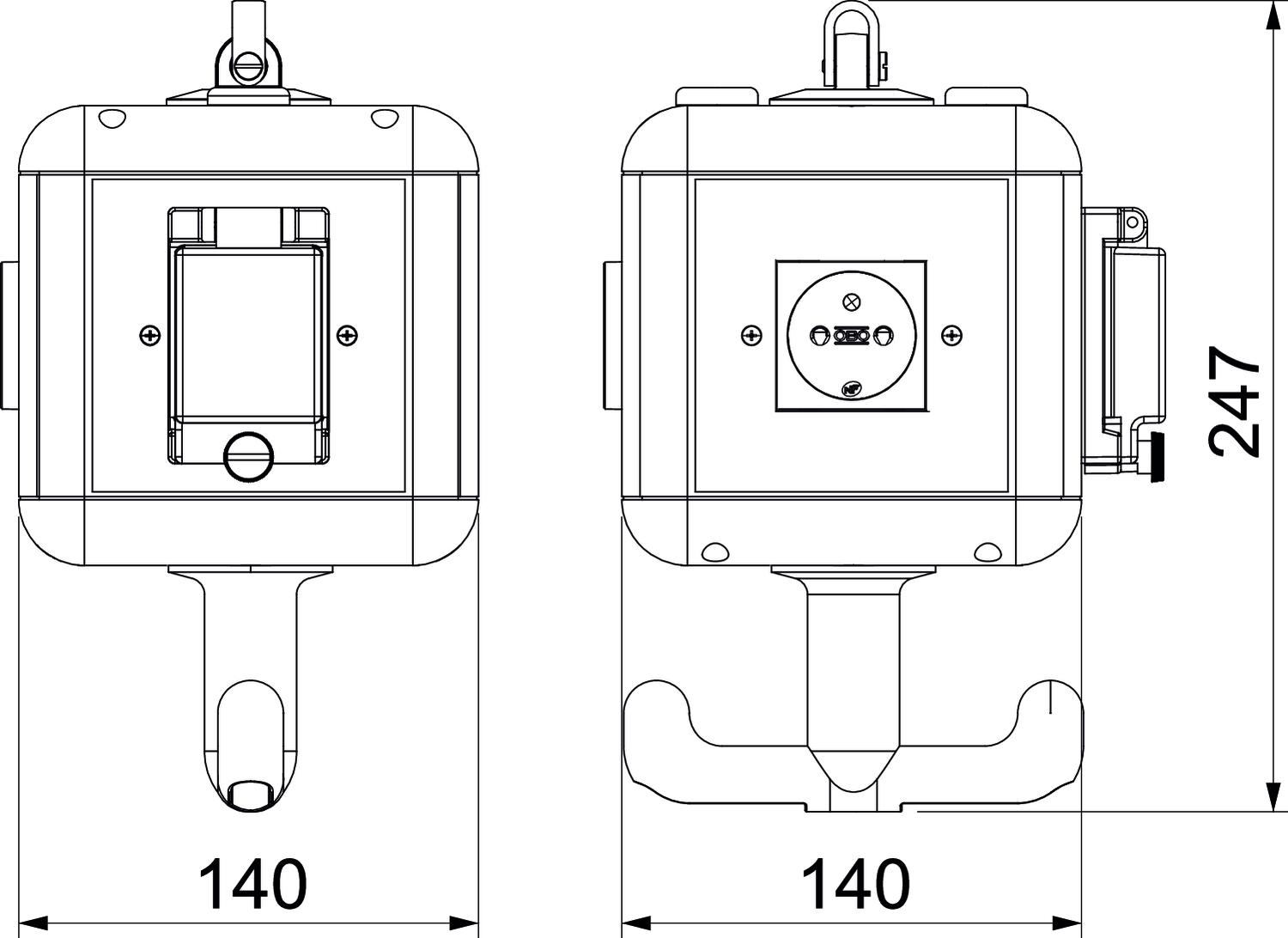2 x 1-voudige contactdoos met randaarde 16 A/250 V met verhoogde aanrakingsveiligheid, op een wisselspanningscircuit voorbedraad, aansluiting via 1 x klem 3-polig, met scheidingsschot voor scheiding stroomcircuits en een FI/LS-schakelaar.