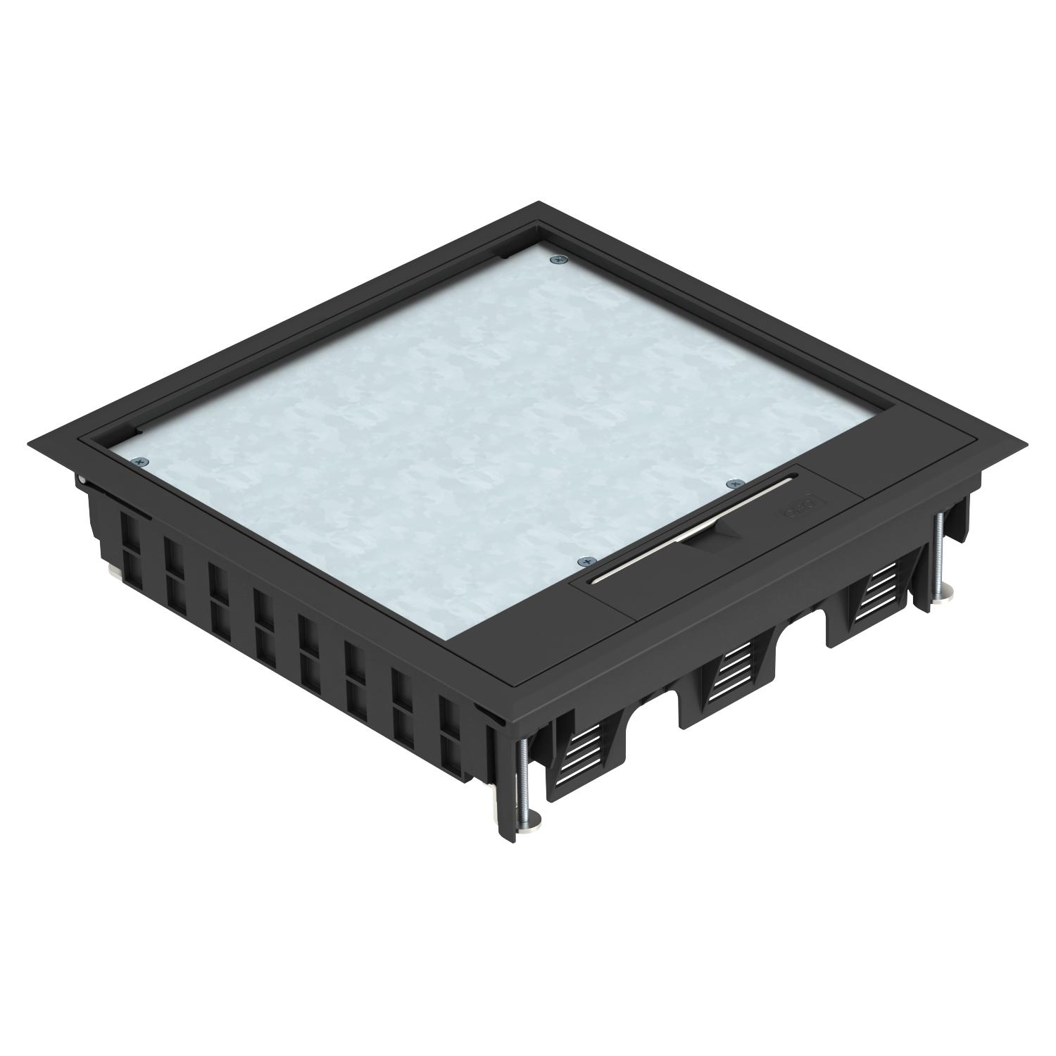 Inbouweenheid met greepbeugel, 3-compartimenten, voor de inbouw van de montagedrager MT9. Er kunnen 3 afdekplaten model APMT5 worden geïnstalleerd. Vloerbedekkingsuitsparing in klapdeksel vooringesteld op 5 mm, indien nodig kan dit ingesteld worden op 10 mm.