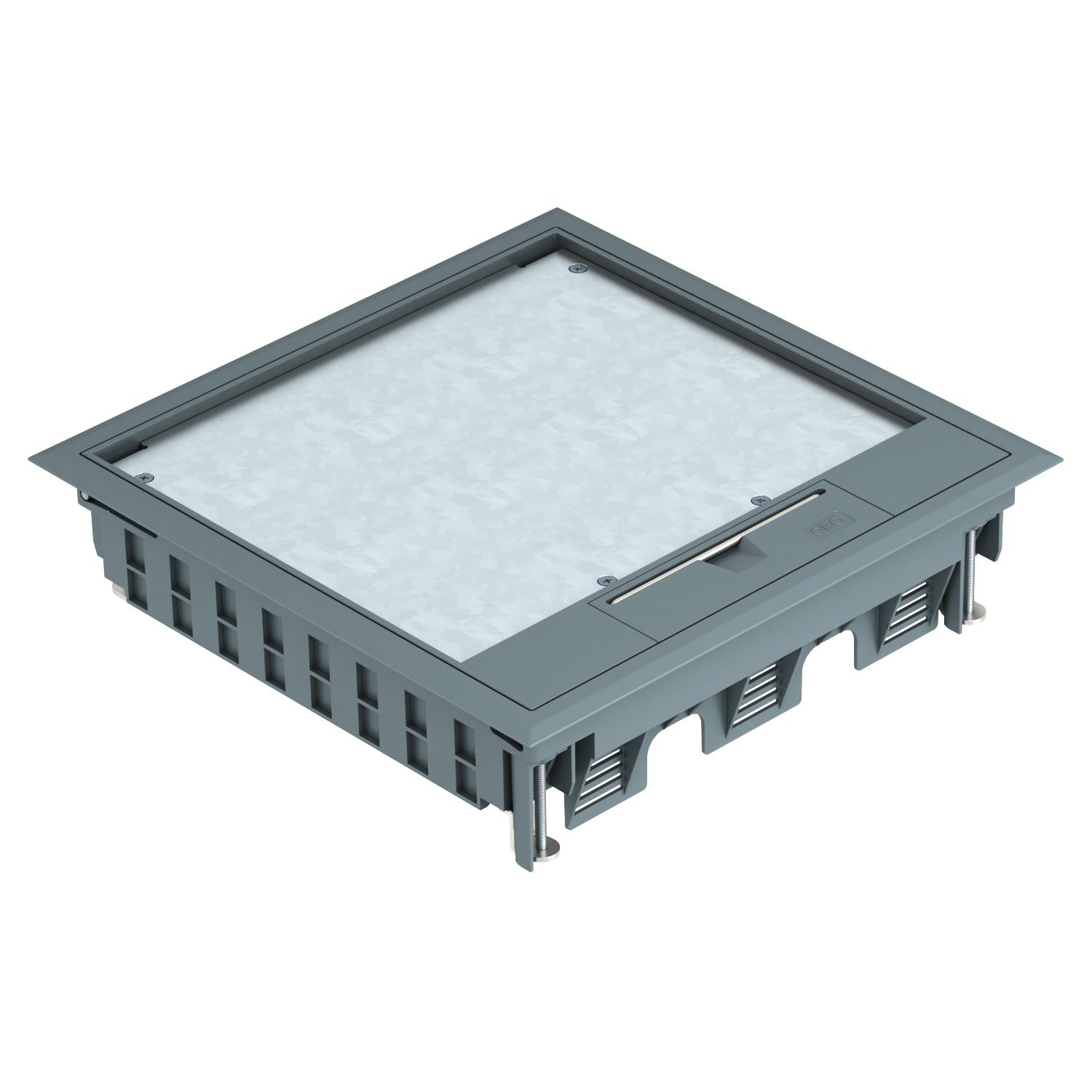 Inbouweenheid met greepbeugel, 3-compartimenten, voor de inbouw van de montagedrager MT9. Er kunnen 3 afdekplaten model APMT5 worden geïnstalleerd. Vloerbedekkingsuitsparing in klapdeksel vooringesteld op 5 mm, indien nodig kan dit ingesteld worden op 10 mm.