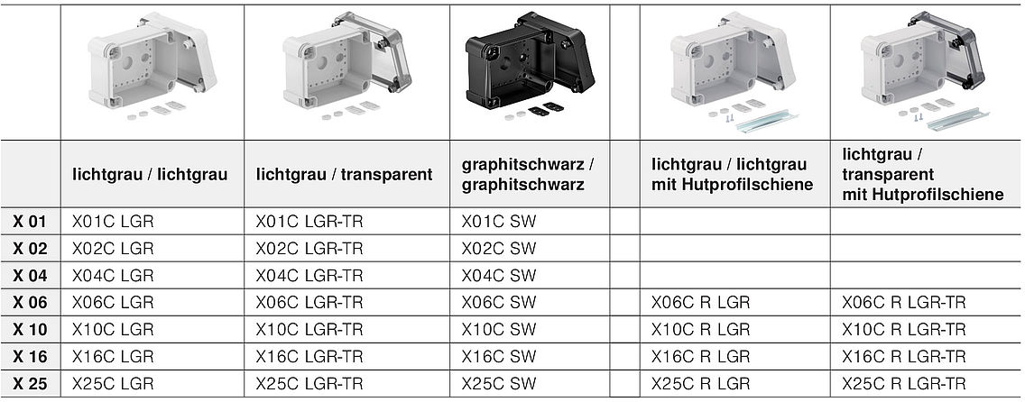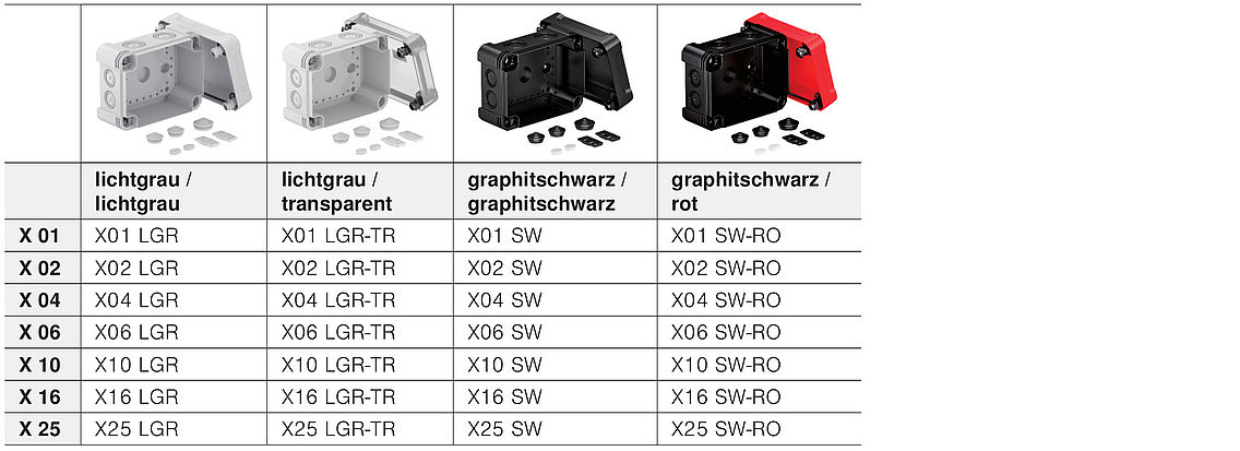 De X-serie is in alle kleurvariaties een blikvanger. De deksels zijn in lichtgrijs, transparant, zwart en rood verkrijgbaar. De onderste delen zijn in lichtgrijs en zwart leverbaar. Verschillende circuits kunnen gemakkelijk van elkaar worden onderscheiden door verschillende samenstellingen.