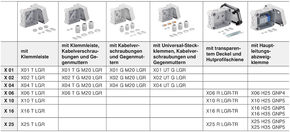 De X-serie is in verschillende uitrustingen verkrijgbaar. Zo zijn er voorgeïnstalleerde complete eenheden, bijvoorbeeld met hoofdleidingaftakklem, wartelsystemen, steekklemmen en DIN-rails verkrijgbaar. Bij alle kabelaansluitdozen zijn echter altijd schroefafdekkingen, kabelinvoeren en externe bevestigingselementen bij de levering inbegrepen. Bovendien biedt de X-serie een omvangrijk toebehorenassortiment.