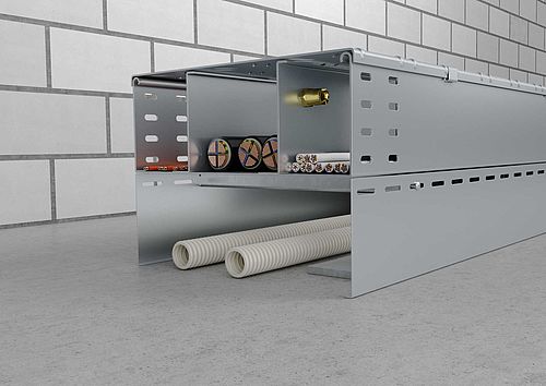 Hoge belastingen, betreden, vuil, stof – al deze uitdagingen worden weerstaan door de betreedbare kabelgoten met deksel dankzij de doordachte systeemeigenschappen. De kabelgoten zijn mechanisch uiterst stabiel en beschermen de kabels en leidingen tegen beschadigingen. Een optimale afschermende werking van de betreedbare kabelgoten garandeert de elektromagnetische compatibiliteit. Een scheidingsschot waarborgt de conform DIN EN 50147 geregelde EMC-scheiding van de vermogens-, besturings- en datakabels. Kabelgoot, deksel en scheidingsschotten hebben een algemene materiaaldikte van 2 mm en vormen zo een uiterst stabiele constructie.