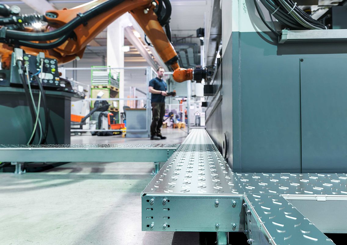 De fabricage van de slipvaste deksels voor onze kabelkanalen, ook kabelgoten genoemd, volgt in twee bewerkingsstappen: op de stansinstallatie en op de profileerinstallatie. Naast de kwaliteitstesten voor elke productiestap controleert een camera in de stansinstallatie de maatvoering van de kabelgoten. Het nieuwe ribbelplaatdeksel van onze betreedbare kabelgoten maakt deze nog meer slipvast. Het ribbelplaatdeksel wordt primair op de stansinstallatie gefabriceerd. Voor de hierbij gebruikte innovatieve fabricagemethode heeft OBO Bettermann een fabricagepatent.
